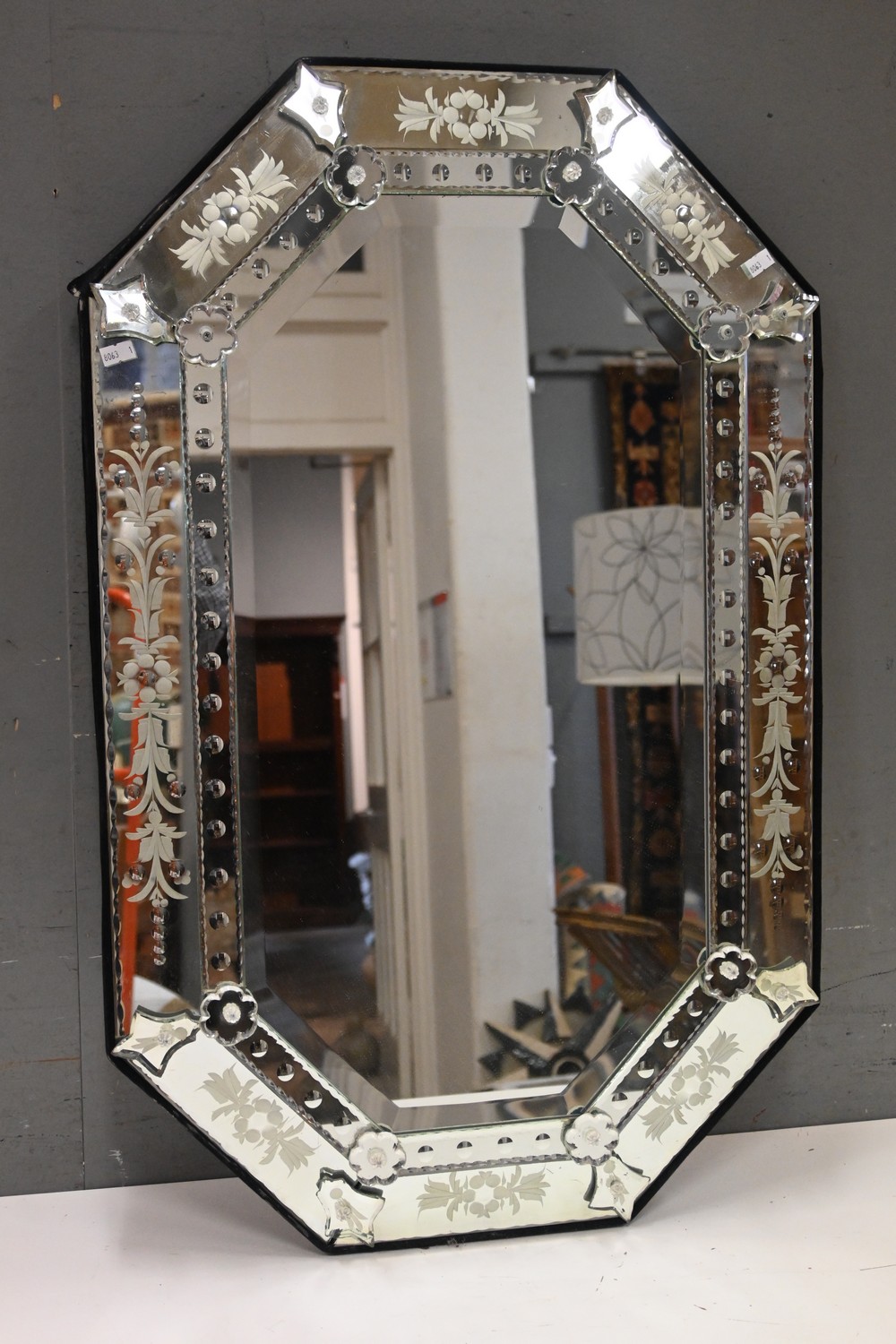 A VENETIAN MIRROR, WITH ETCHED DECORATION TO THE BORDER PLATES (84H X 53W CM) (LEONARD JOEL DELIVERY SIZE: LARGE)