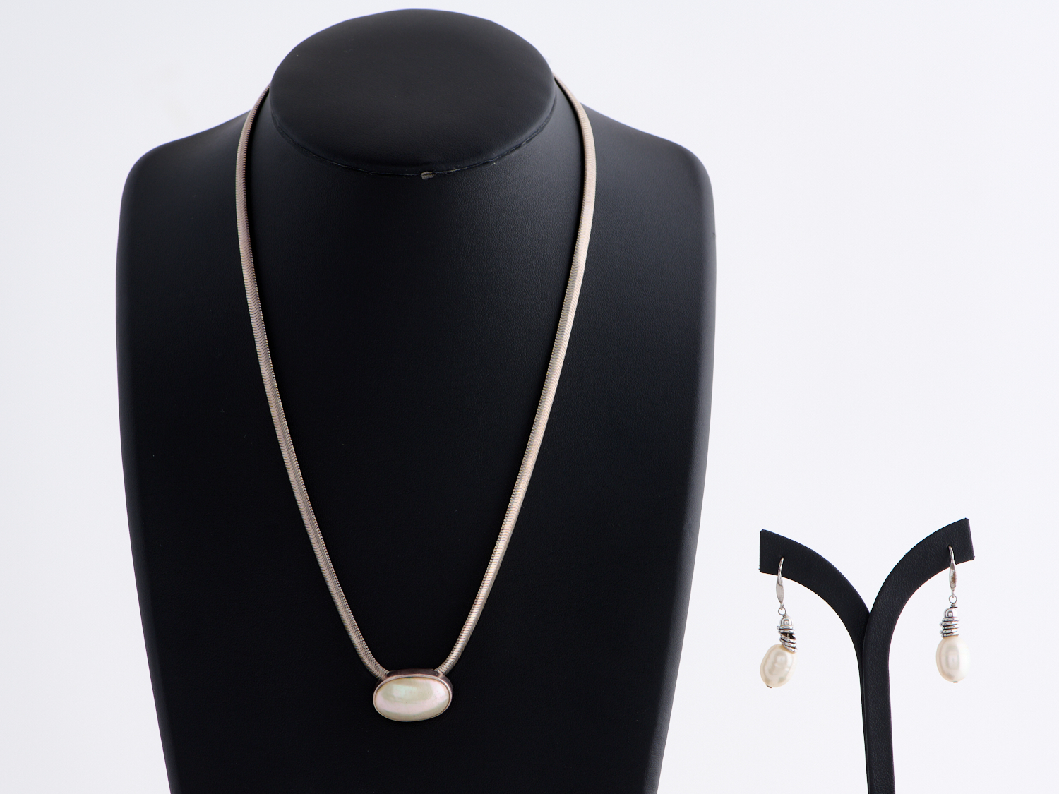 A FRESHWATER PEARL JEWELLERY SUITE IN STERLING SILVER, COMPRISING A NECKLACE AND EARRINGS TO SHEPHERDS HOOK FITTINGS