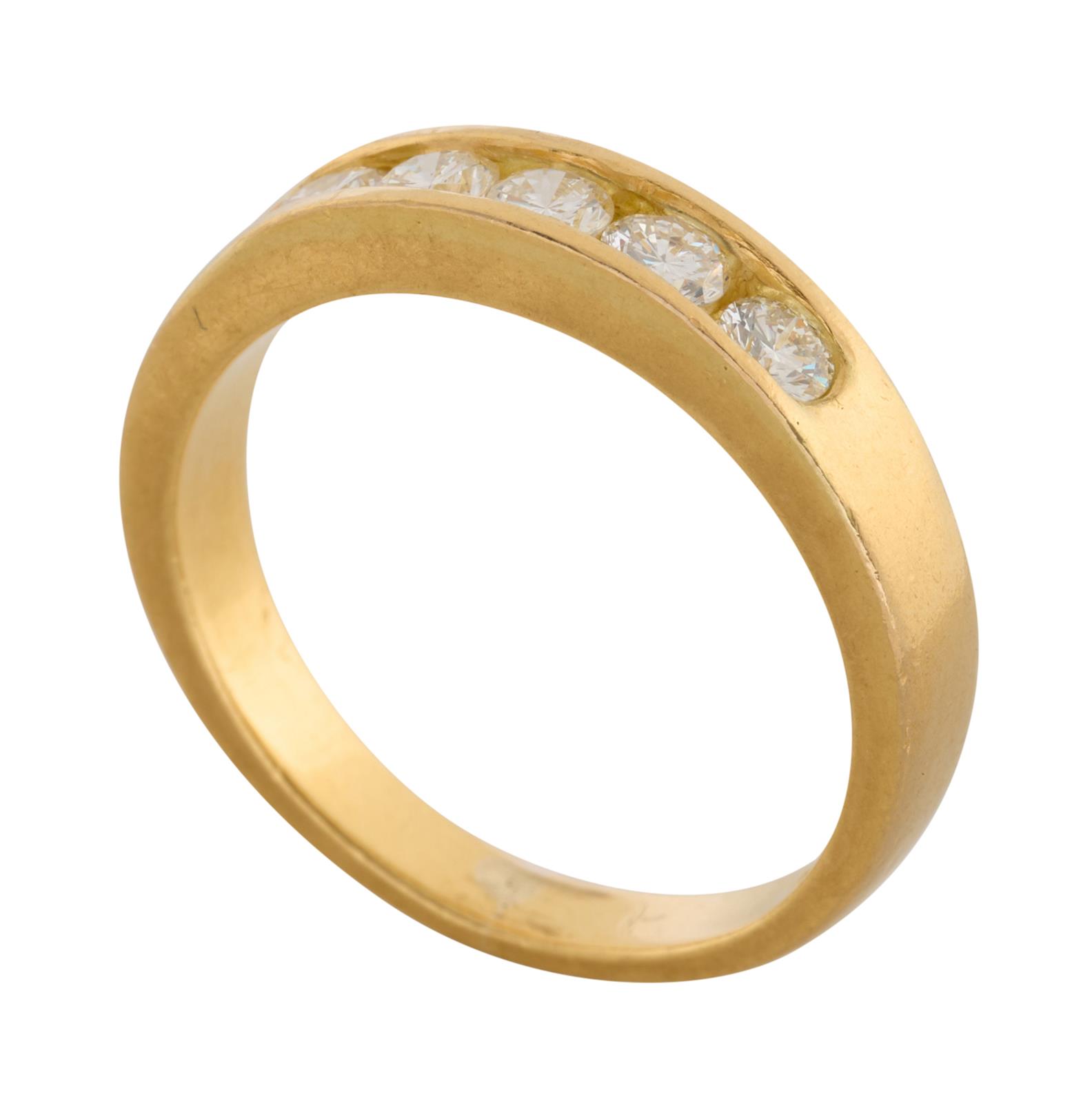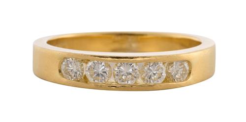 A CHANNEL SET DIAMOND RING IN 18CT GOLD, RING SIZE K/L, 4.13GMS