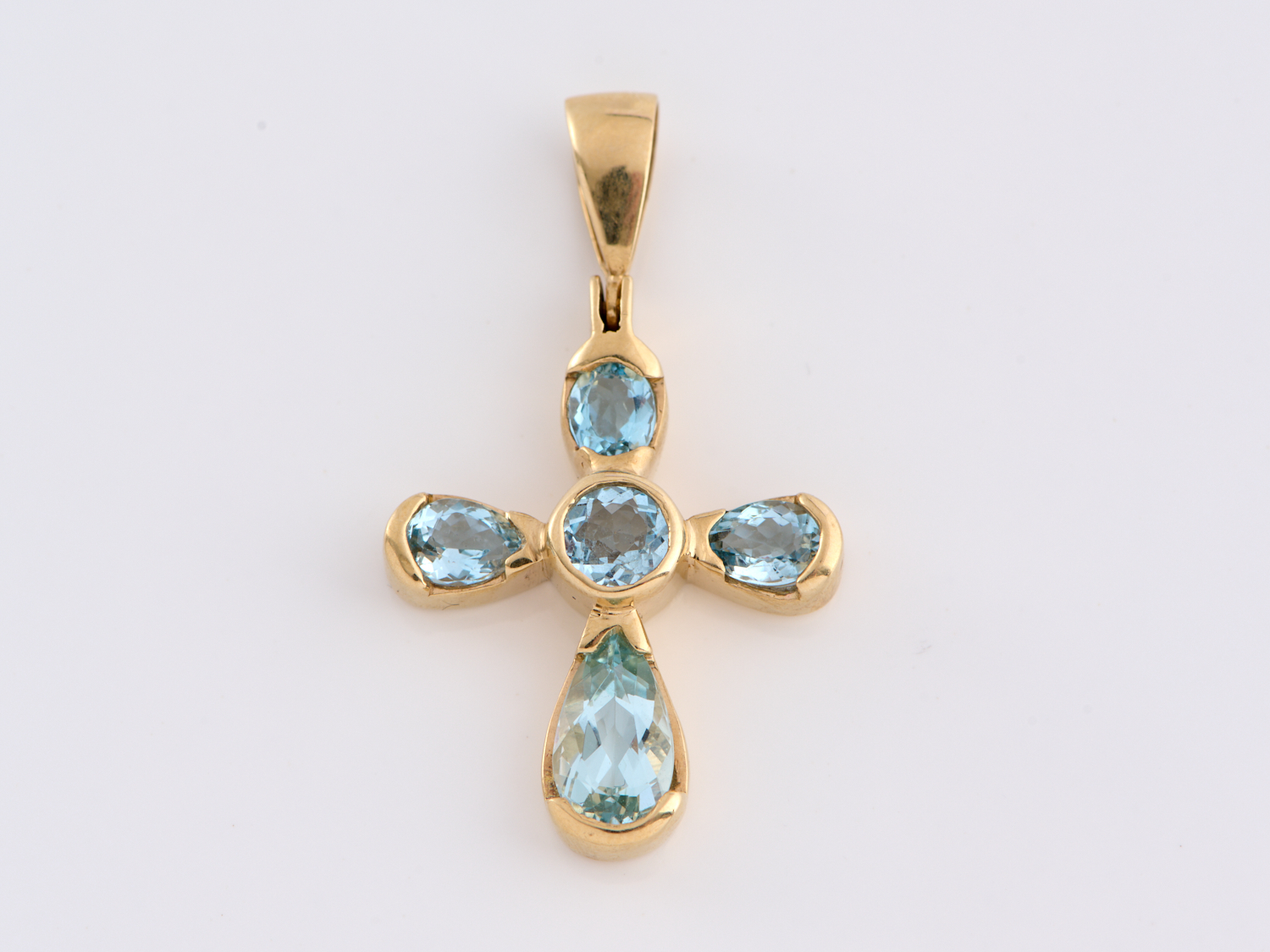 A BLUE TOPAZ CROSS PENDANT IN 9CT GOLD, 5.44GMS, LENGTH 35MM FROM BAIL