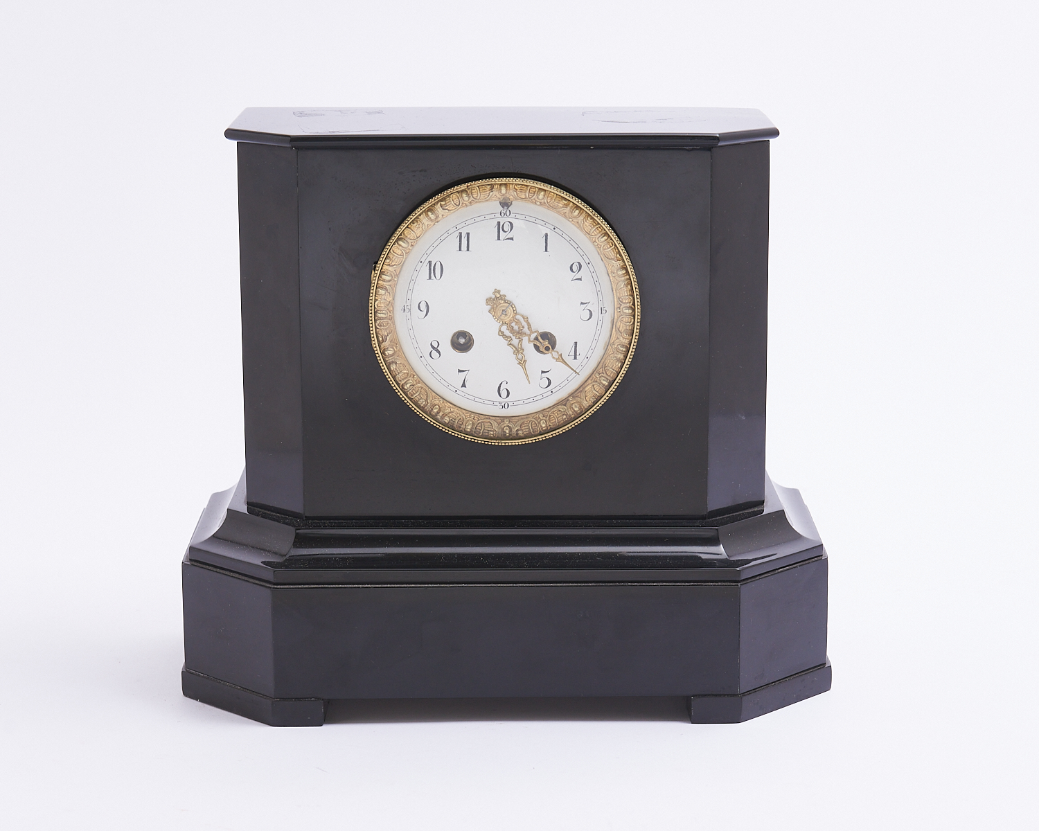 A FRENCH BLACK MARBLE CLOCK H.27CM X W.30.5CM, LEONARD JOEL LOCAL DELIVERY: MEDIUM