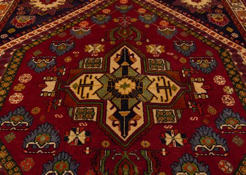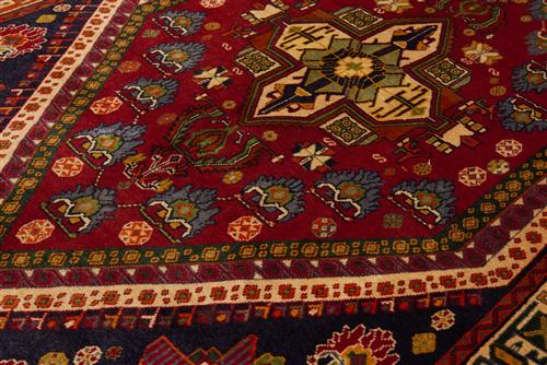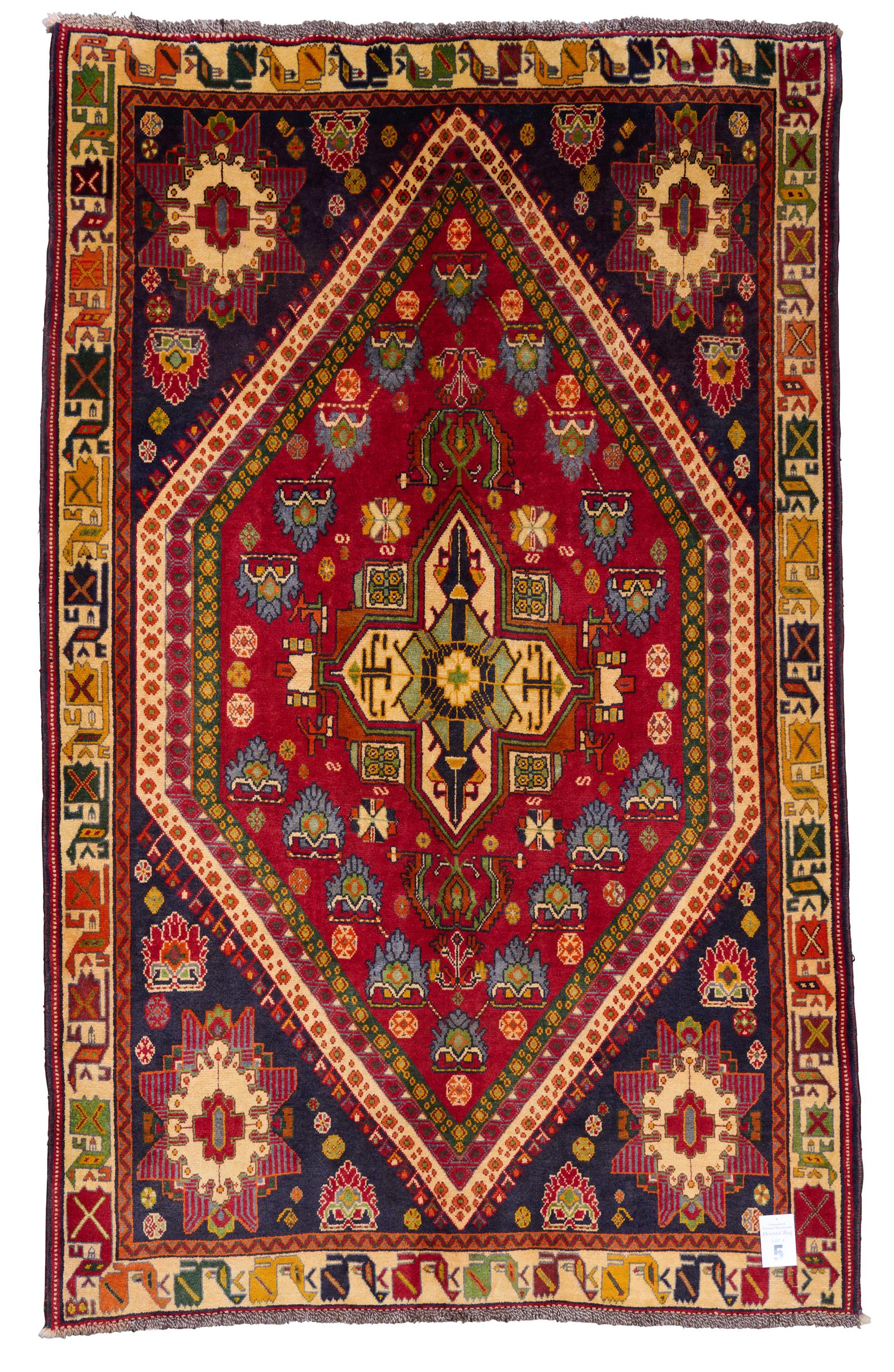 A TRIBAL PERSIAN QASHQAIE RUG. 100% HAND SPUN WOOL, NATURAL DYES, EXTREMELY DENSE AND SOLID HEAVY PILE. HAND-KNOTTED TRIBAL QASHQAIE WEAVE FROM THE FARS PROVINCE WITH TRIBAL DESIGN OF DIAMOND-SHAPED LATCH-HOOKED MEDALLION CONTAINING AN AMULET SET WITHIN A SOFT RED FIELD OF TRIBAL MOTIFS. SURROUNDING FIELD OF MOTIFS SET IN A NAVY FIELD. PEACOCK DESIGN THROUGH THE BORDER SIZE: 270 X 171 CM ORIGIN: IRAN - RRP: $3,400 DOCUMENTATION OF AUTHENTICITY INCLUDED.
