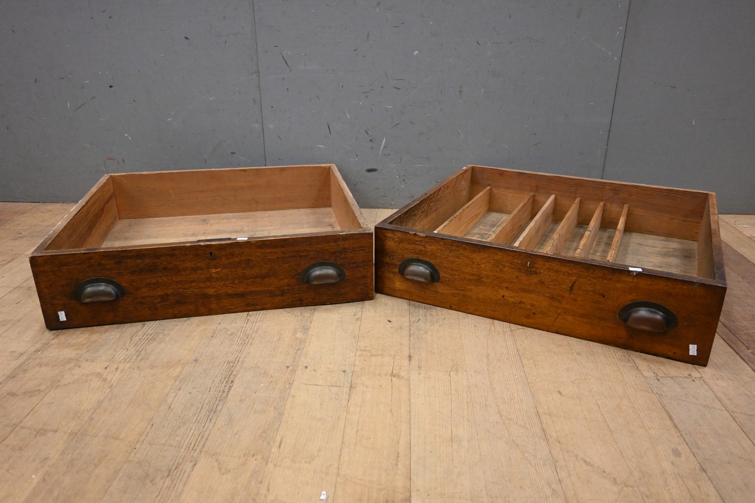 TWO VICTORIAN CEDAR AND PINE LARGE DRAWERS - ONE WITH INTERNAL DIVIDERS (H18 X W71 X D66 CM) (LEONARD JOEL DELIVERY SIZE: LARGE)