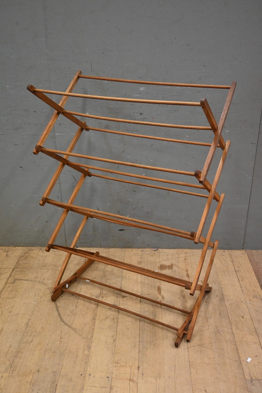 AN AUSTRALIAN FOLDING WOODEN CLOTHES RACK (A/F) (107H X 73W X 42D CM) (LEONARD JOEL DELIVERY SIZE: MEDIUM)