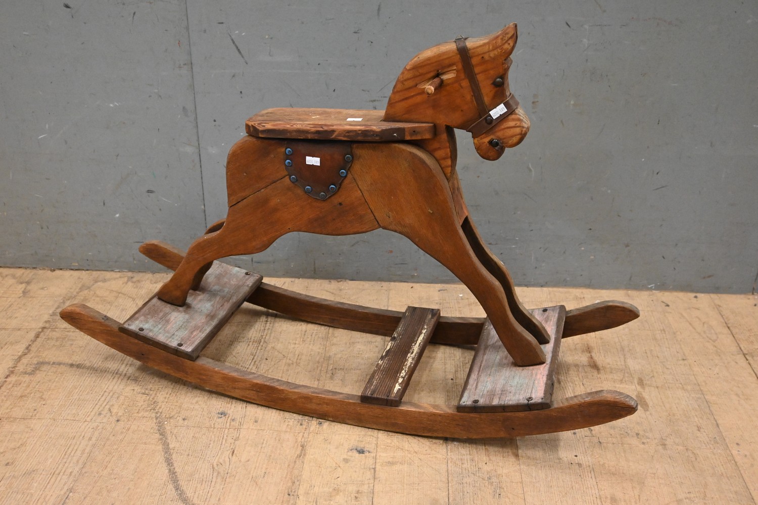 A 1920S AUSTRALIAN PINE ROCKING HORSE (A/F) (60H X 94W X 28D CM) (LEONARD JOEL DELIVERY SIZE: LARGE)