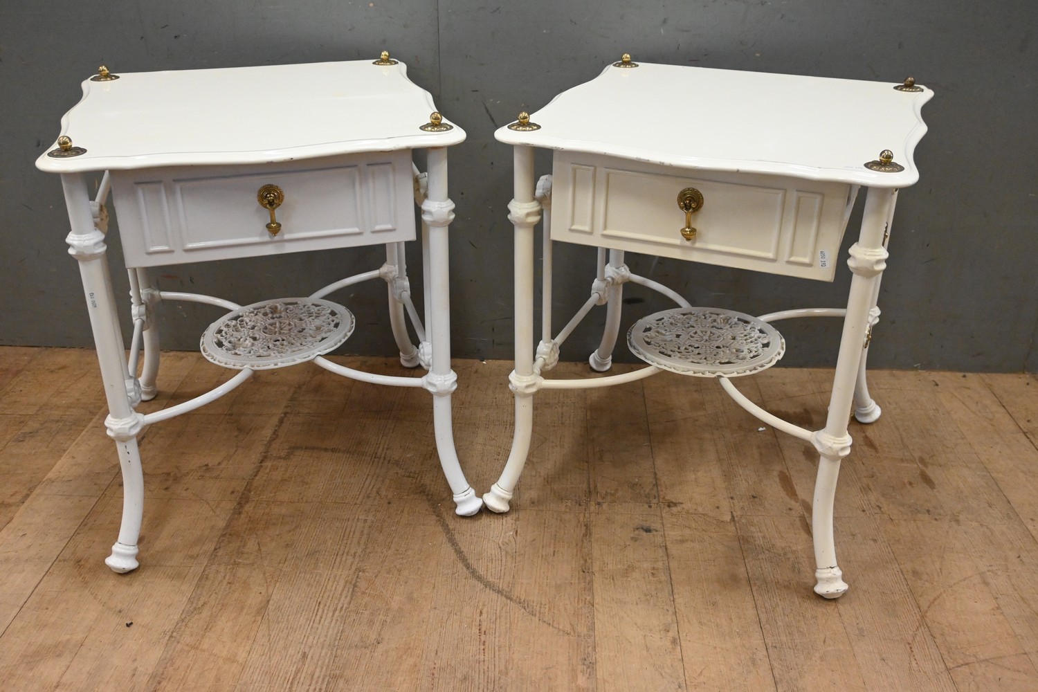 A PAIR OF VICTORIAN STYLE PAINTED WHITE CAST IRON AND BRASS ADORNES SINGLE DRAWER BEDSIDE CABINETS (59H X 53W X 52D CM) (LEONARD JOEL DELIVERY SIZE: LARGE)