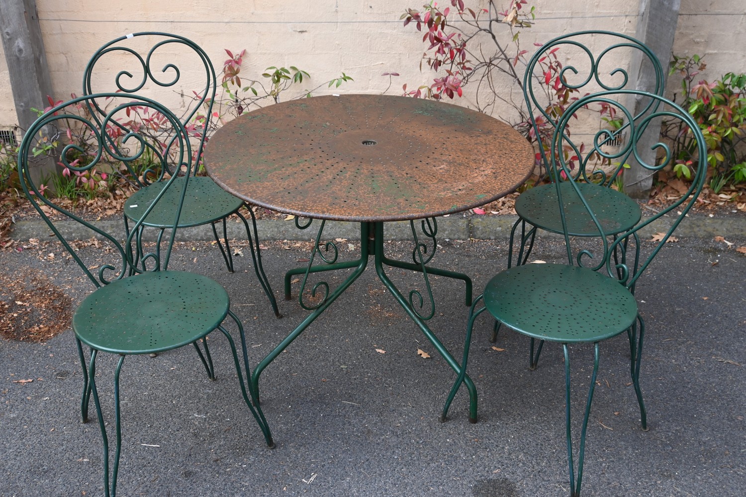 A FRENCH GREEN CAST IRON FIVE PIECE PATIO SETTING (A/F) (73H X 95D CM) (LEONARD JOEL DELIVERY SIZE: X-LARGE)