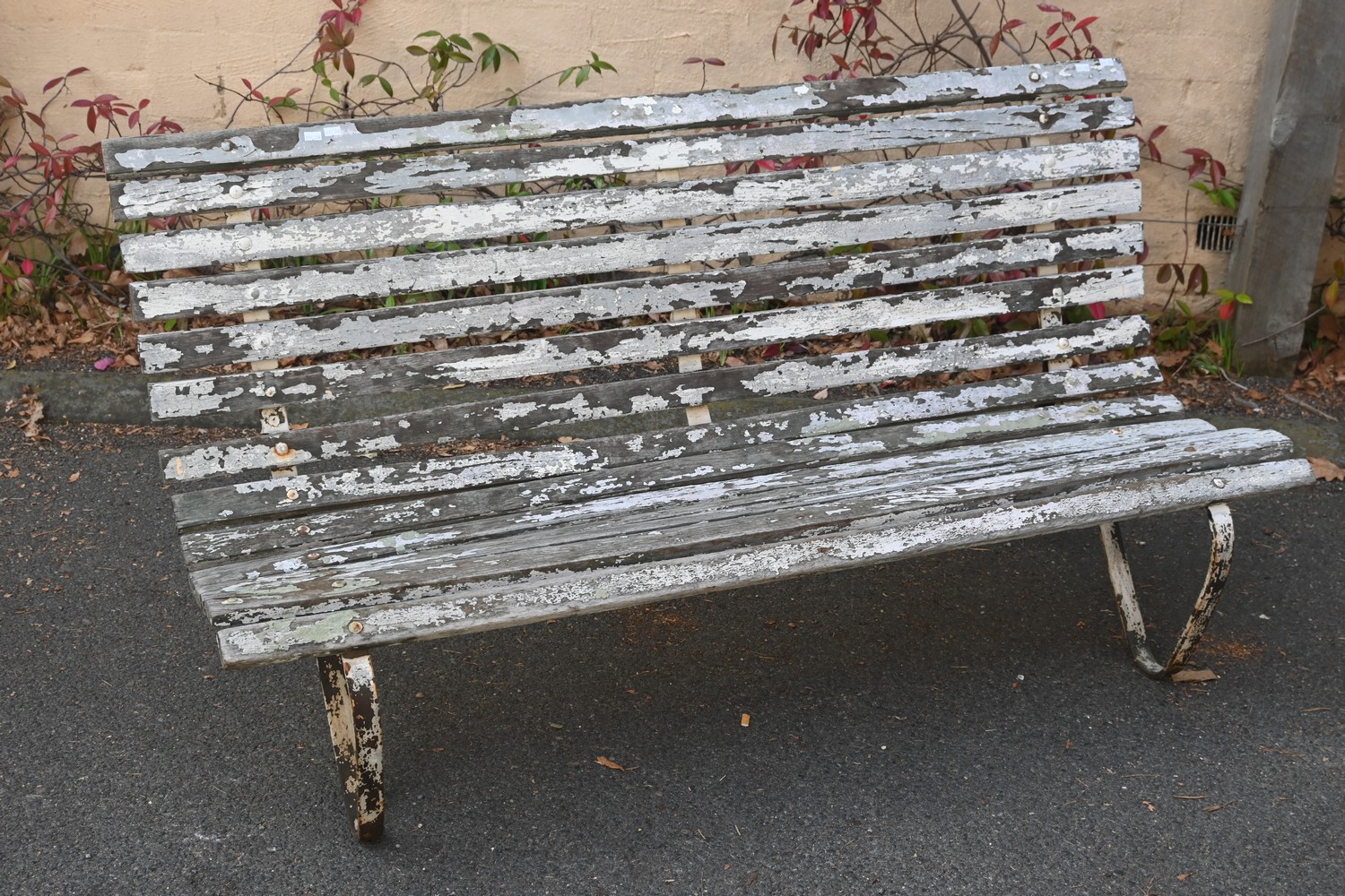 A FRENCH PAINTED OAK AND CAST IRON BASED GARDEN BENCH SEAT (A/F) (79H X 150W X 61D CM) (LEONARD JOEL DELIVERY SIZE: X-LARGE)