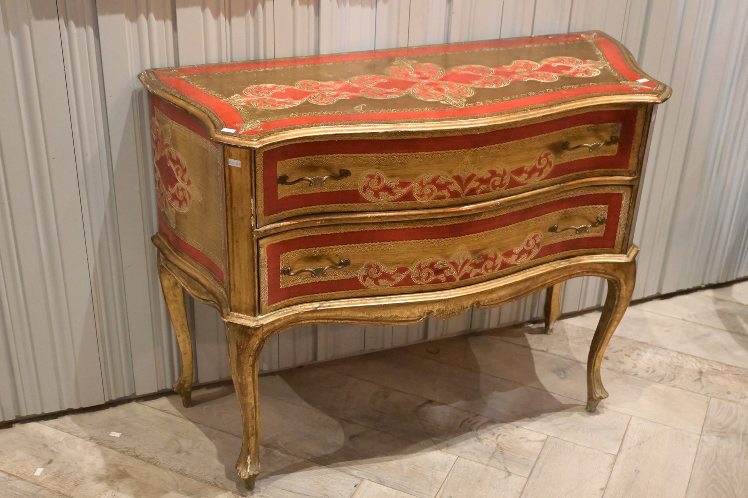 AN ITALIAN FLORENTINE RED AND GILT SERPENTINE-FRONT CHEST OF TWO DRAWERS (77H X 101W X 41D CM) (LEONARD JOEL DELIVERY SIZE: LARGE)