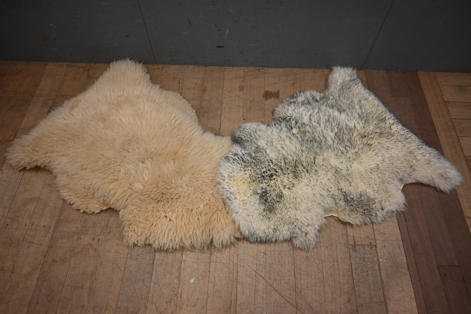 TWO ORIGINAL STAMPED AUSTRALIAN WOOL SHEEP PELTS (A/F) (63 X 95 CM) (LEONARD JOEL DELIVERY SIZE: MEDIUM)