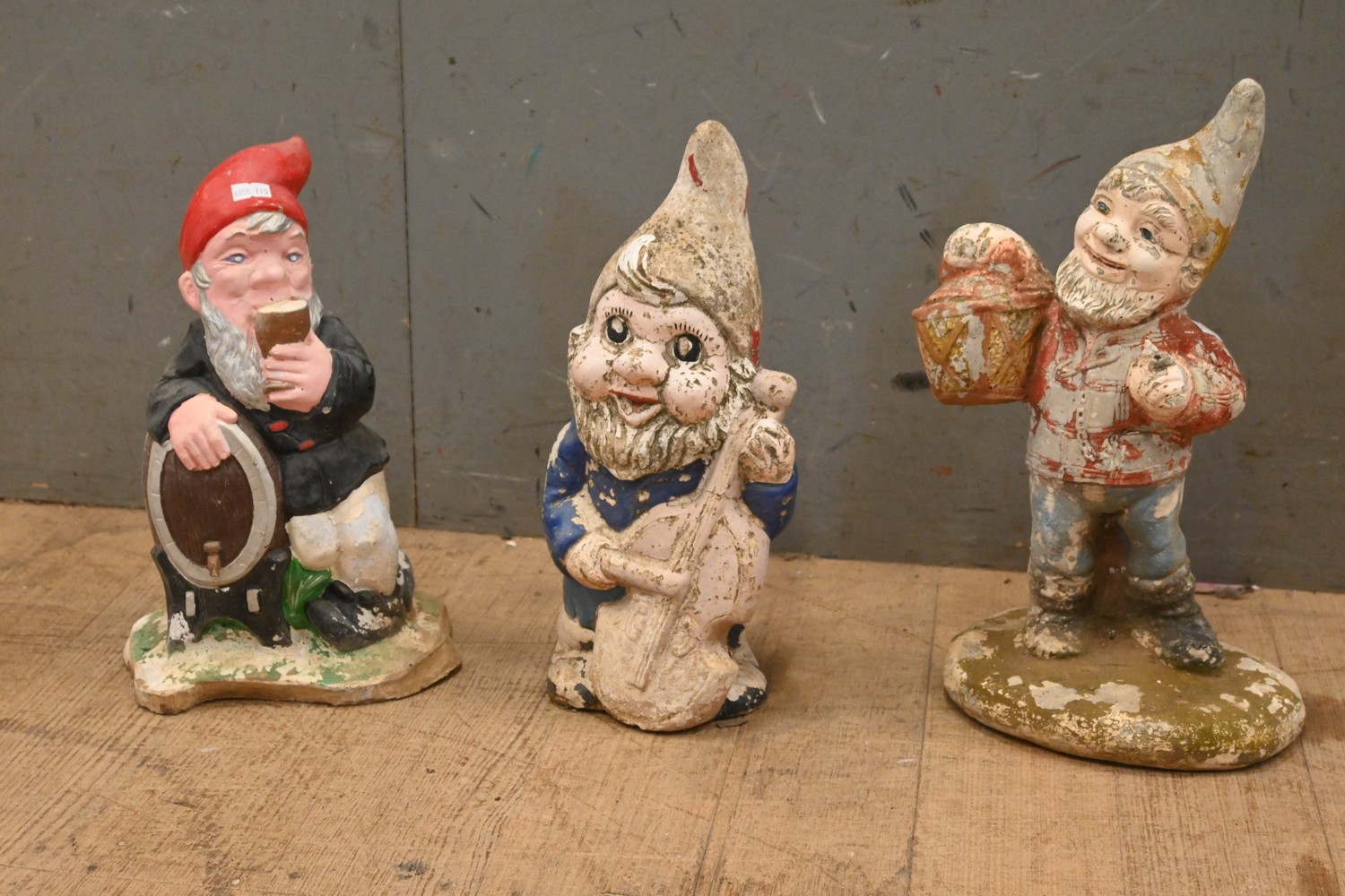 A GROUP OF 3 VINTAGE PAINTED GARDEN GNOMES (37H CM) (LEONARD JOEL DELIVERY SIZE: MEDIUM)