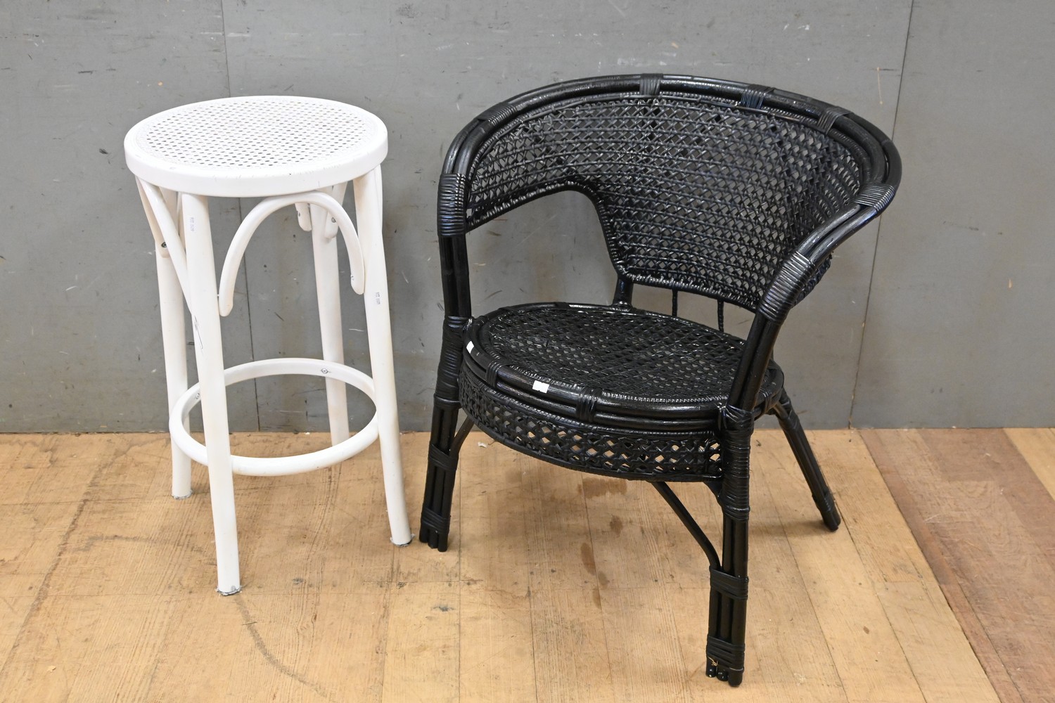 A WHITE BENTWOOD AND CANE TOPPED STOOL AND BLACK BENTWOOD ARMCHAIR ( A/F) ( 68H X 65W X 63D CM) (LEONARD JOEL DELIVERY SIZE: LARGE)