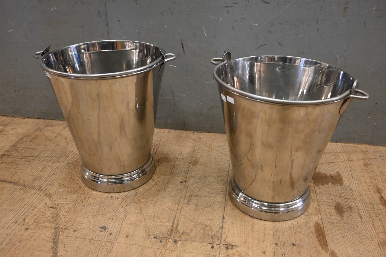 A PAIR OF STAINLESS STEEL SWING HANDLED BUCKETS (33H X 28D CM) (LEONARD JOEL DELIVERY SIZE: MEDIUM)