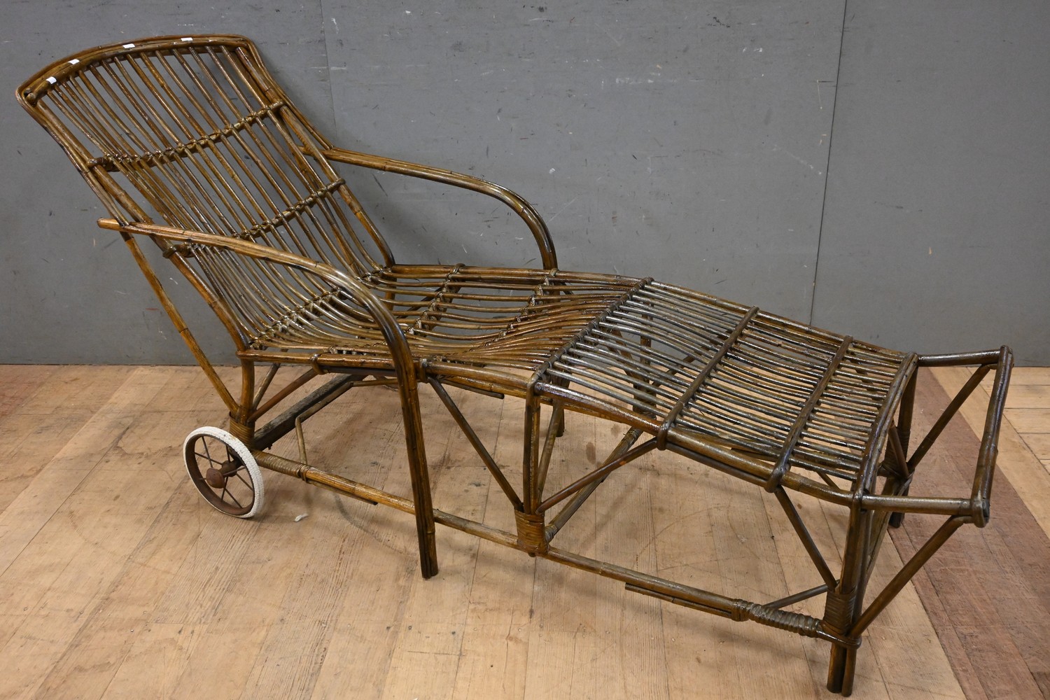 A CANE LOUNGE CHAIR WITH ORIGINAL METAL AND RUBBER WHEELS (A/F) (83H X 57W X 177D CM) (LEONARD JOEL DELIVERY SIZE: LARGE)