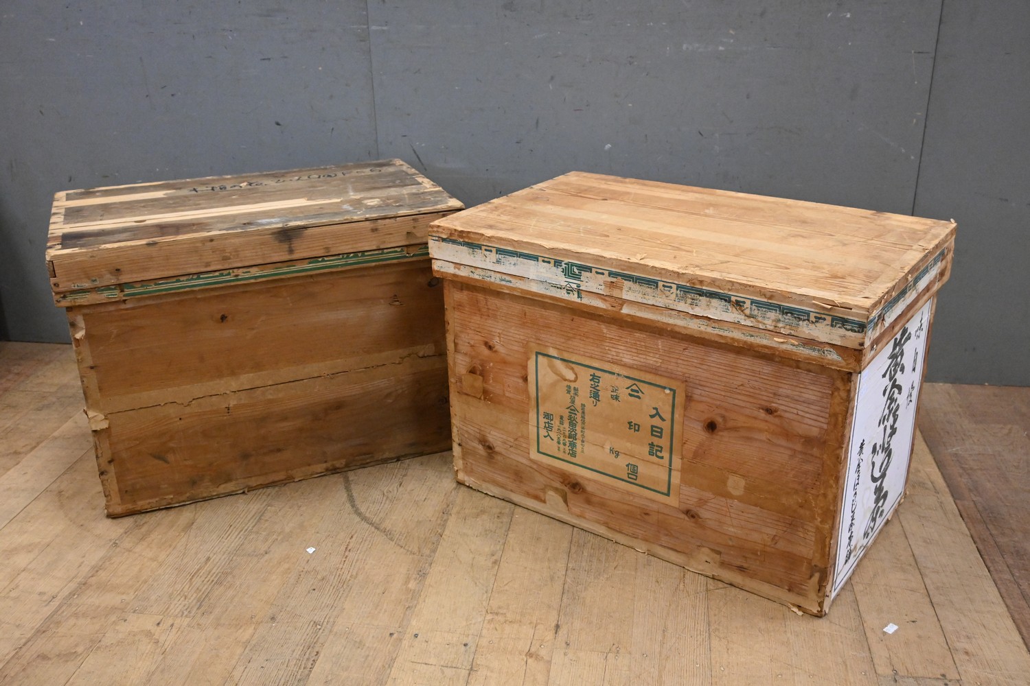 TWO VINTAGE JAPANESE TEACHESTS (48H X 67W X 43D CM) (LEONARD JOEL DELIVERY SIZE: LARGE)