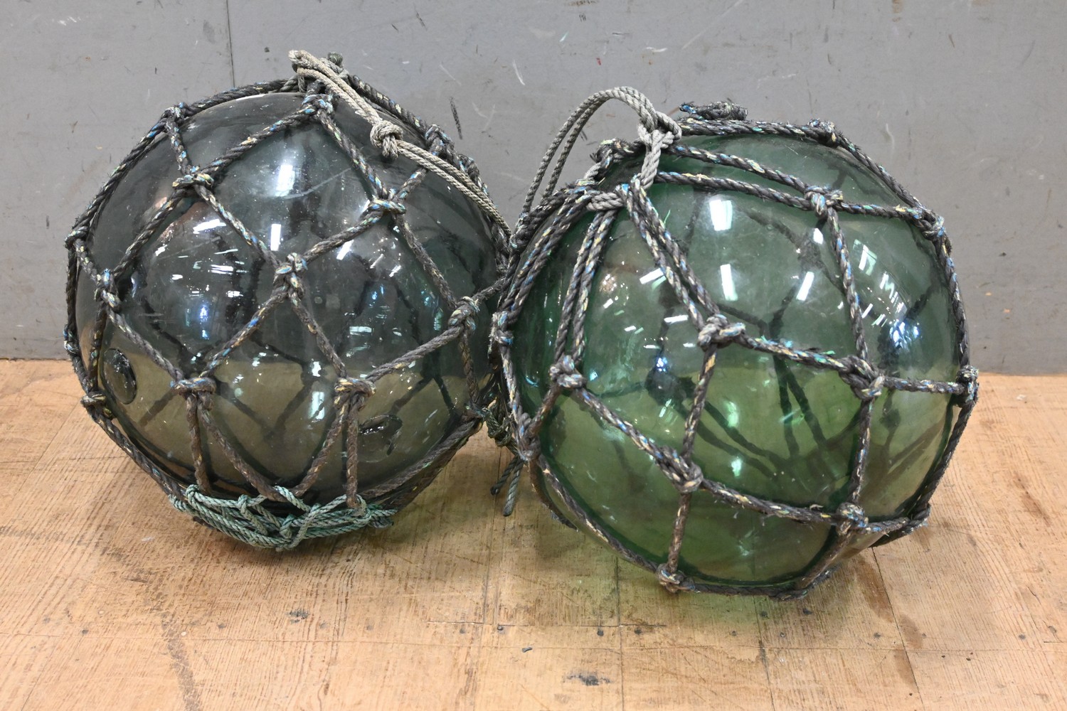 TWO ANTIQUE GREEN GLASS AND ROPE BOUND SHIPS BUOYS / FISHING FLOATS (37D CM) (LEONARD JOEL DELIVERY SIZE: LARGE)