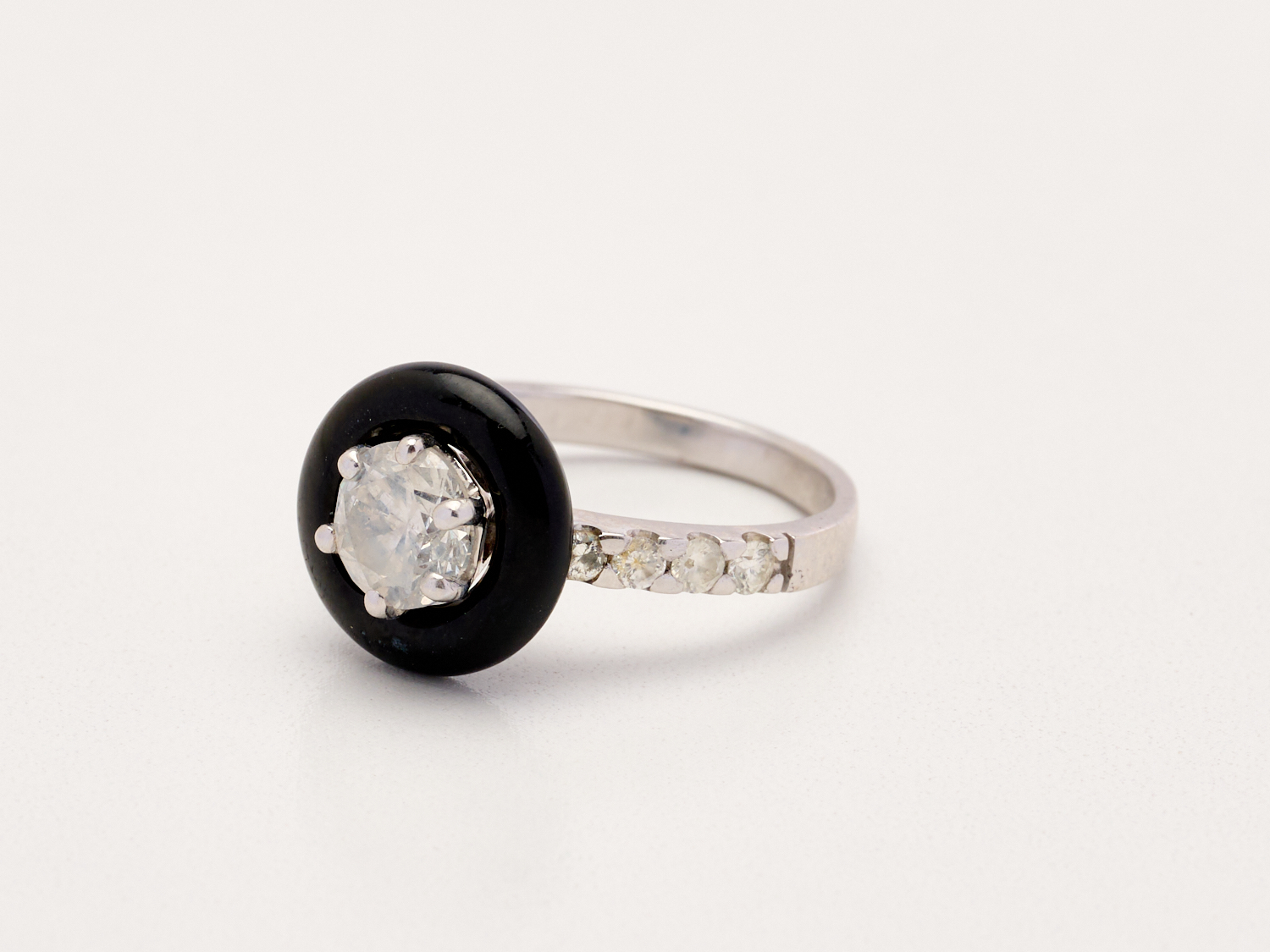 A DIAMOND AND ONYX RING IN 18CT WHITE GOLD, THE CENTERING DIAMOND WEIGHING 1.06CTS, THE SHOULDERING DIAMONDS TOTALLING 0.25CTS, RING SIZE K/L