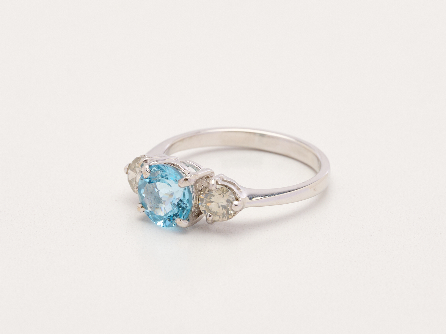 AN AQUAMARINE AND DIAMOND RING IN 18CT WHITE GOLD, THE AQUAMARINE WEIGHING 1.32CTS, THE DIAMONDS TOTALLING 0.64CTS, RING SIZE N, WEIGHT 3.41GMS