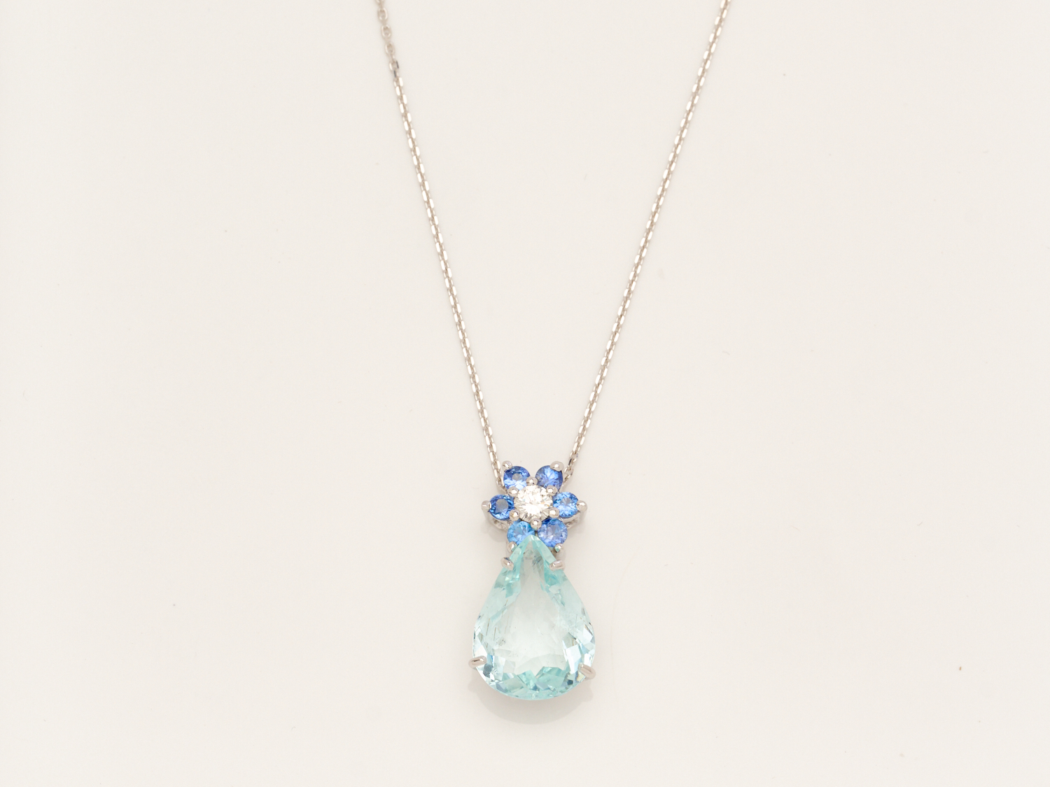 AN AQUAMARINE, SAPPHIRE AND DIAMOND PENDANT IN 18CT WHITE GOLD, TO A FINE CHAIN IN 18CT WHITE GOLD, THE AQUAMARINE WEIGHING 3.90CTS
