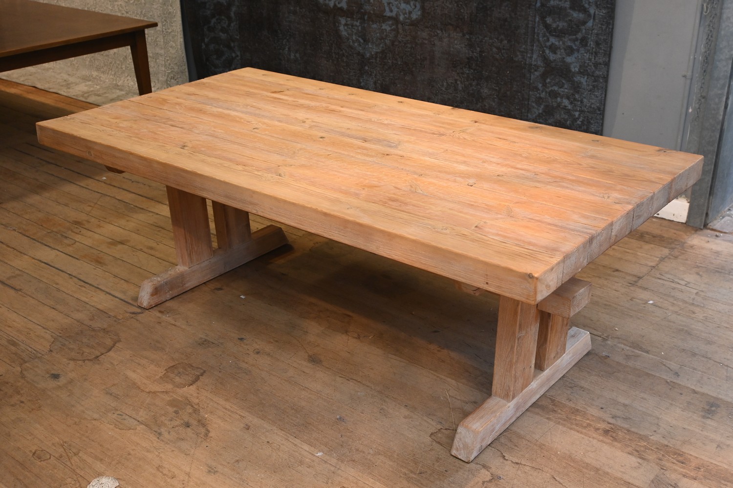 A SUBSTANTIAL RUSTIC PINE REFECTORY-TYPE DINING TABLE (A/F) (73H X 200W X 104D CM) (PLEASE NOTE THIS HEAVY ITEM MUST BE REMOVED BY CARRIERS AT THE CUSTOMER'S EXPENSE. LEONARD JOEL STAFF CANNOT ASSIST CARRYING THIS ITEM) (X-LARGE ITEM)
