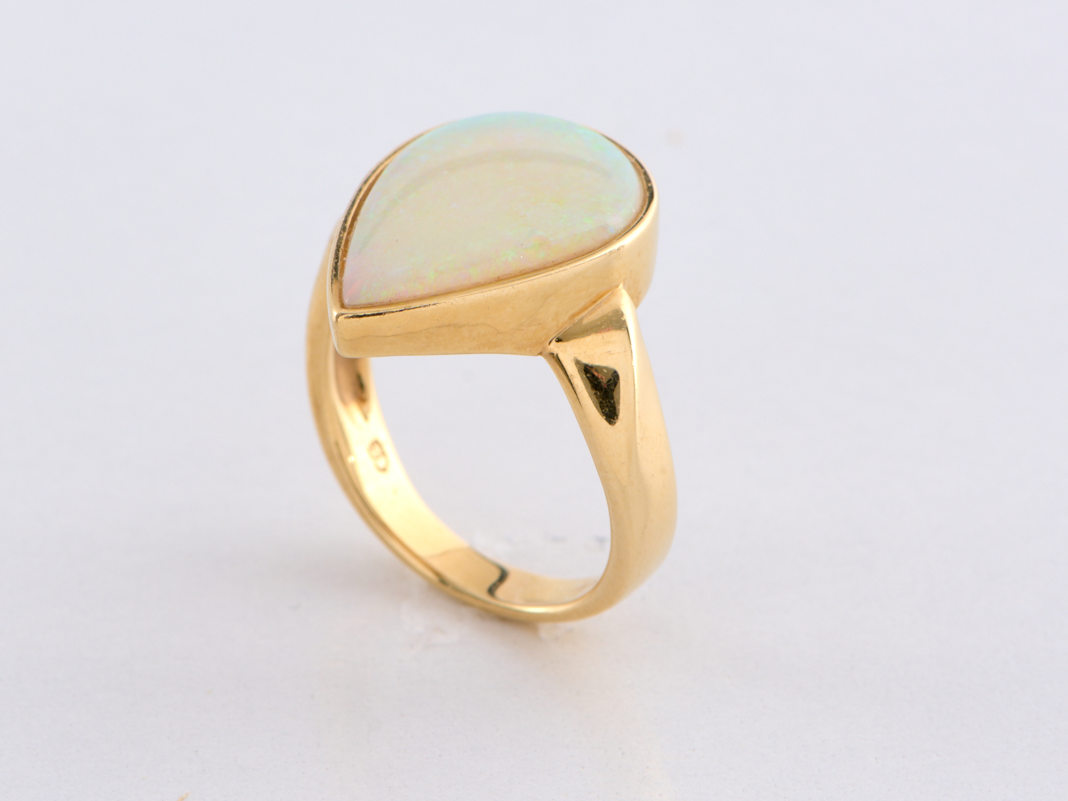 AN OPAL RING IN 14CT GOLD, THE OPAL MEASURING 17MM X 12MM, SIZE N, 4.9GMS