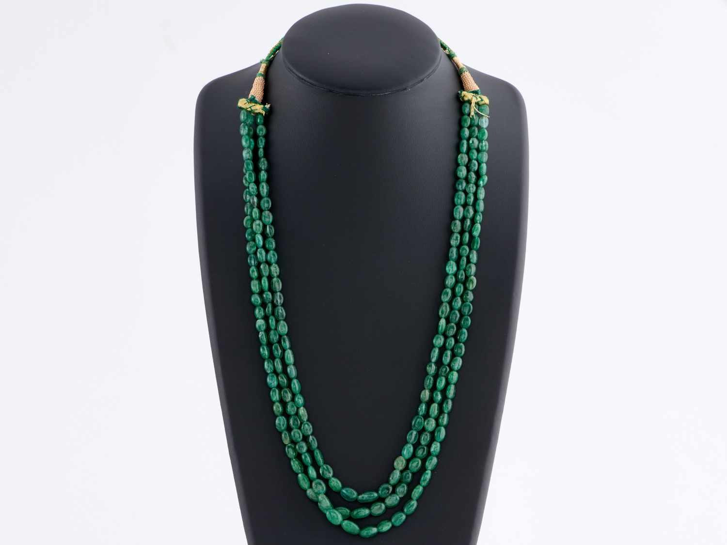 A TRIPLE STRAND OF EMERALD BEADS, TO AN ADJUSTABLE GREEN AND GOLD CHORD