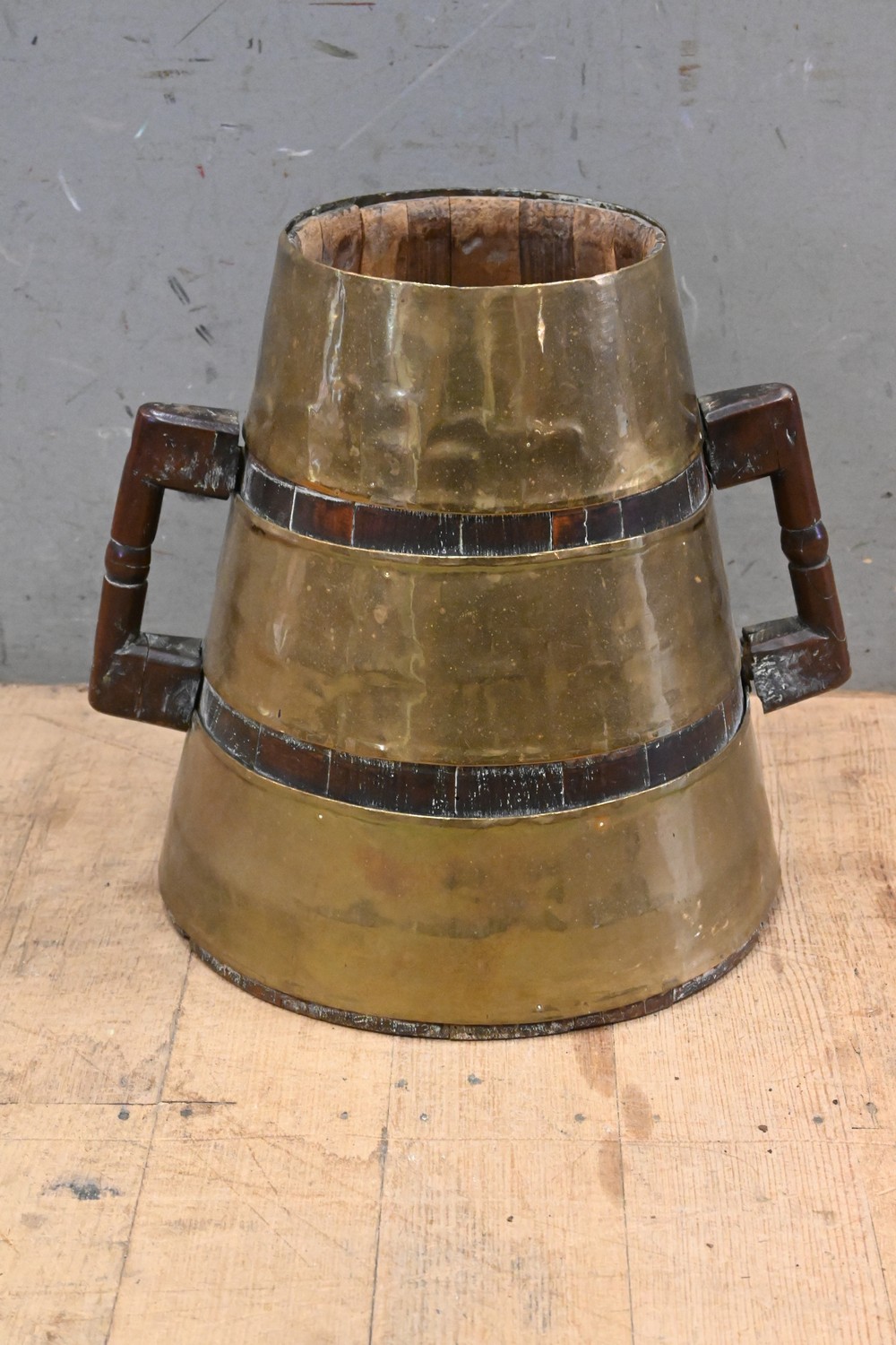 A COPPER AND WOOD PLANTER (A/F) (36H X 36D M) (LEONARD JOEL DELIVERY SIZE: MEDIUM)