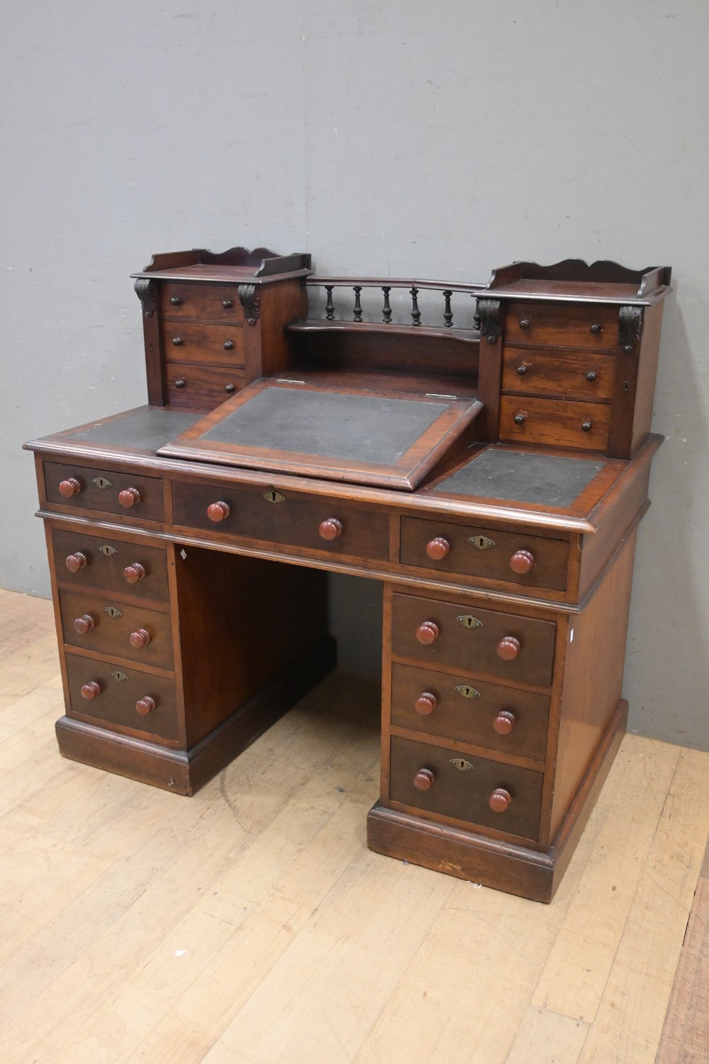 A VICTORIAN CEDAR 'DICKENS' DESK WITH LEATHER-LINED TOP (LACKING KEYS - A/F) (114H X 122W X 68D CM) (PLEASE NOTE THIS HEAVY ITEM MUST BE REMOVED BY CARRIERS AT THE CUSTOMER'S EXPENSE. LEONARD JOEL STAFF CANNOT ASSIST CARRYING THIS ITEM) (X-LARGE ITEM)