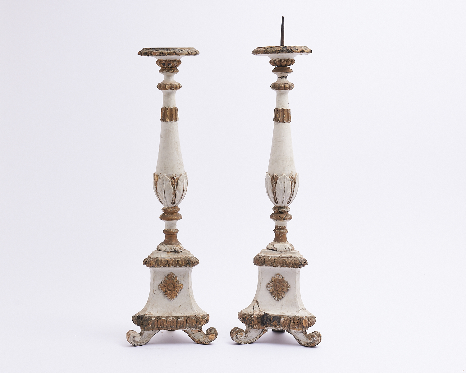 A PAIR OF CARVED WOOD PRICKET CANDLESTICKS (A/F) H.68CM, LEONARD JOEL LOCAL DELIVERY: MEDIUM