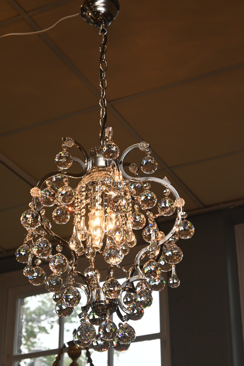 A CONTEMPORARY THREE GLOBE CRYSTAL BALL CHANDELIER (95H 45D CM) (LEONARD JOEL DELIVERY SIZE: LARGE)
