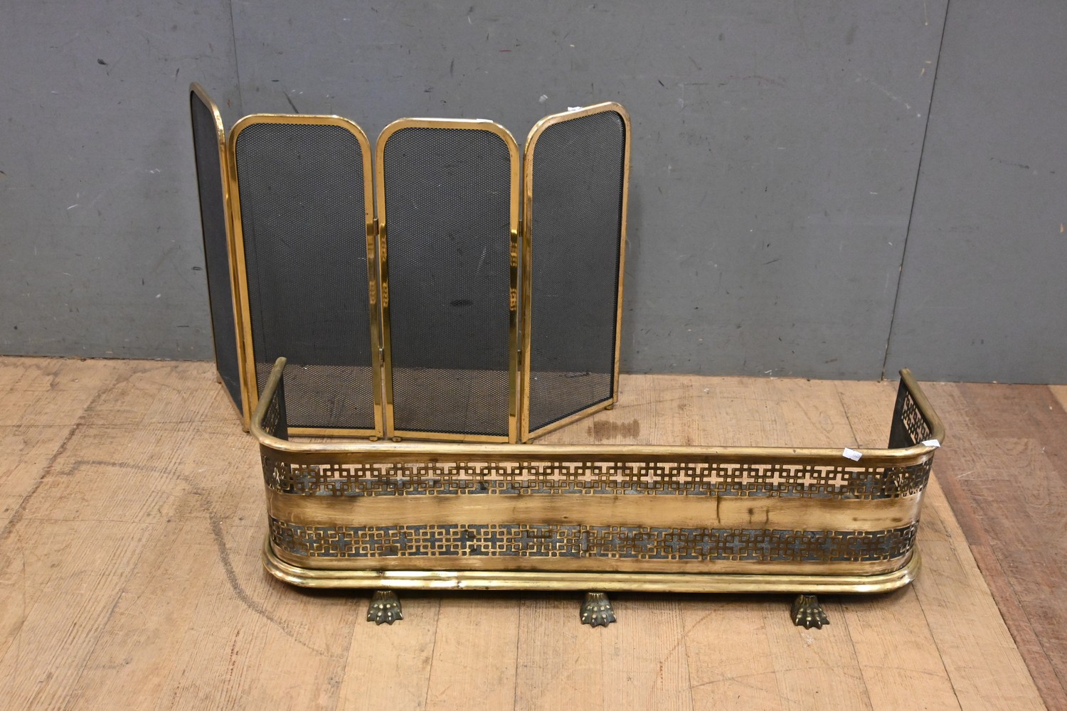 A PIERCED BRASS HEARTH FENDER AND A BRASS-FRAMED FIRESCREEN (24H X 91W X 35D CM) (LEONARD JOEL DELIVERY SIZE: LARGE)
