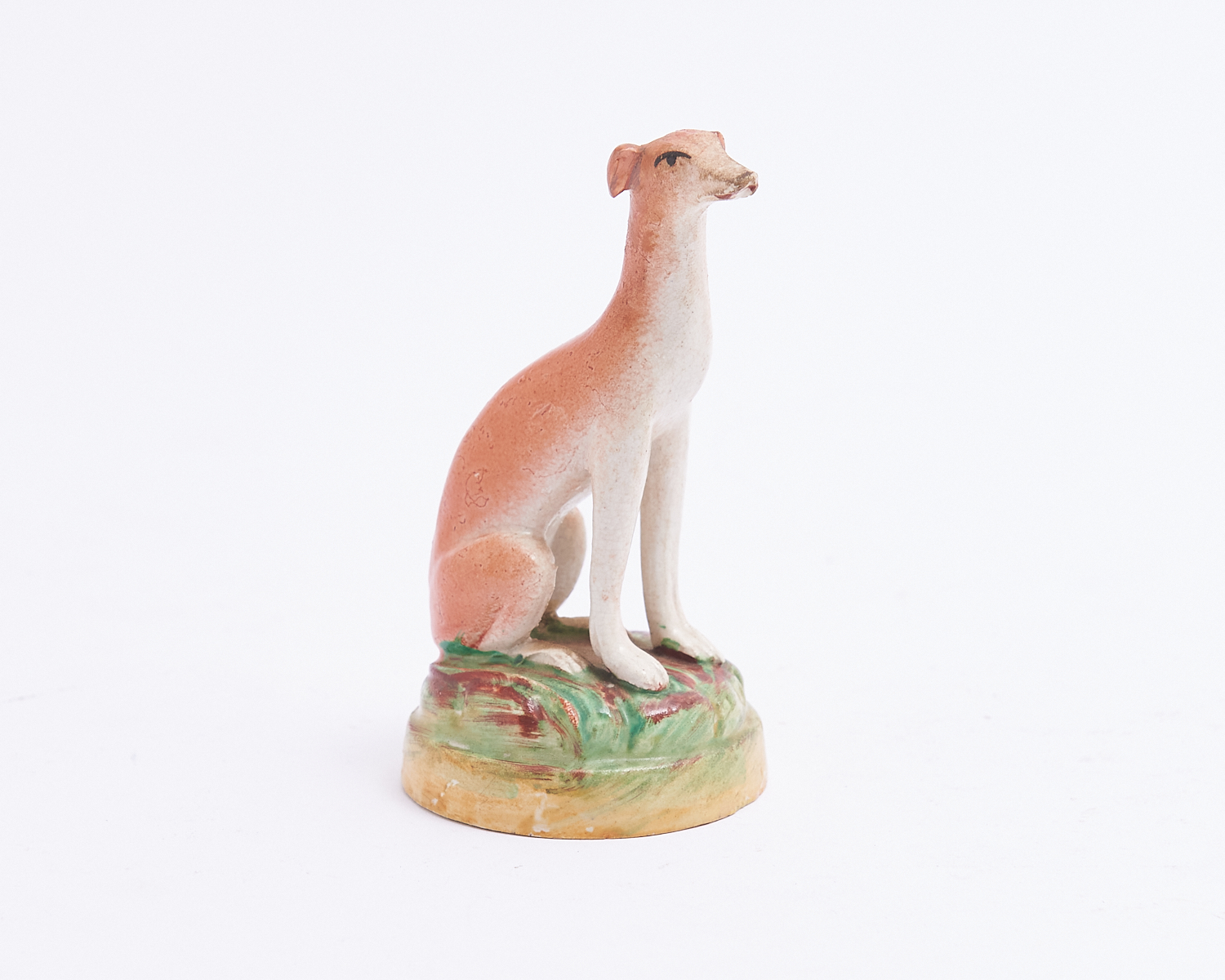 A 19TH CENTURY STAFFORDSHIRE GREYHOUND FIGURE, H.10.5CM, LEONARD JOEL LOCAL DELIVERY: SMALL