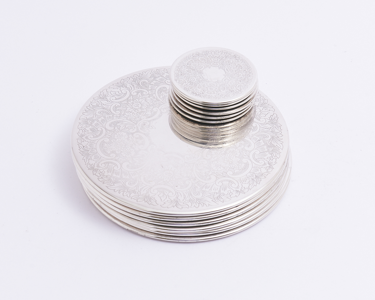 SIX STRACHAN SILVERPLATED PLACEMATS AND SIX DRINK COASTERS DIA.20.5CM (LARGEST), LEONARD JOEL LOCAL DELIVERY: SMALL