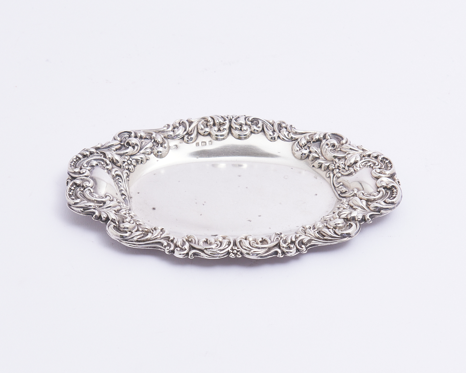 A STERLING SILVER OVAL EMBOSSED JEWELLERY DISH - 65 GRAMS L.17CM, LEONARD JOEL LOCAL DELIVERY: SMALL
