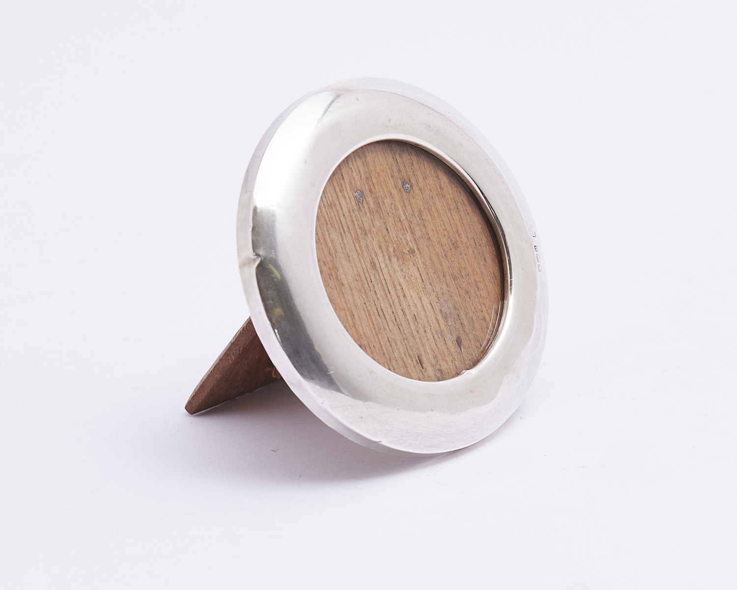 A STERLING SILVER CIRCULAR OAK BACKED PICTURE FRAME (A/F) DIA.8.5CM, LEONARD JOEL LOCAL DELIVERY: SMALL