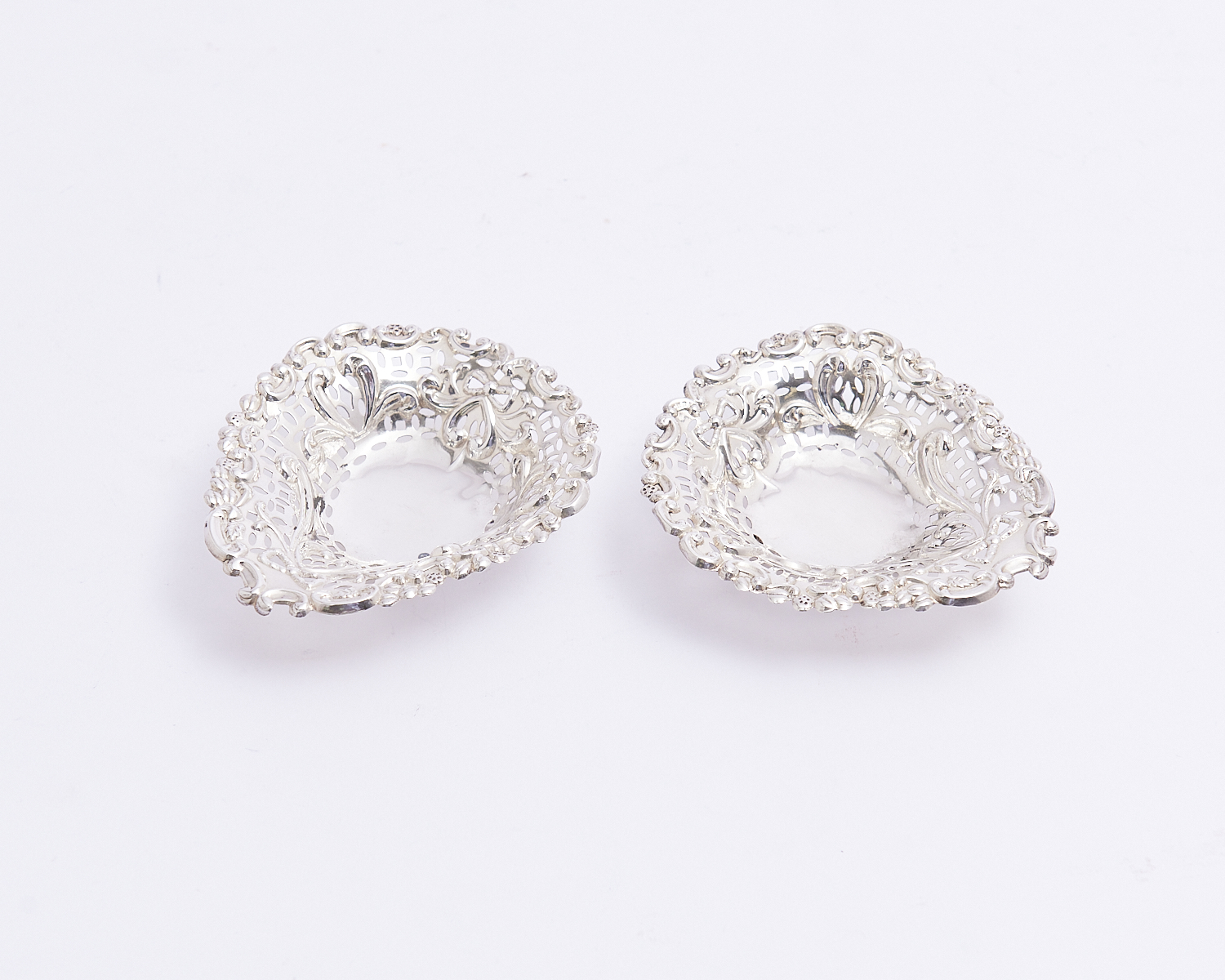 TWO STERLING SILVER HEART SHAPED PIERCED AND EMBOSSED LOVEHEART SHAPED DISHES - 45 GRAMS W.9CM, LEONARD JOEL LOCAL DELIVERY: SMALL