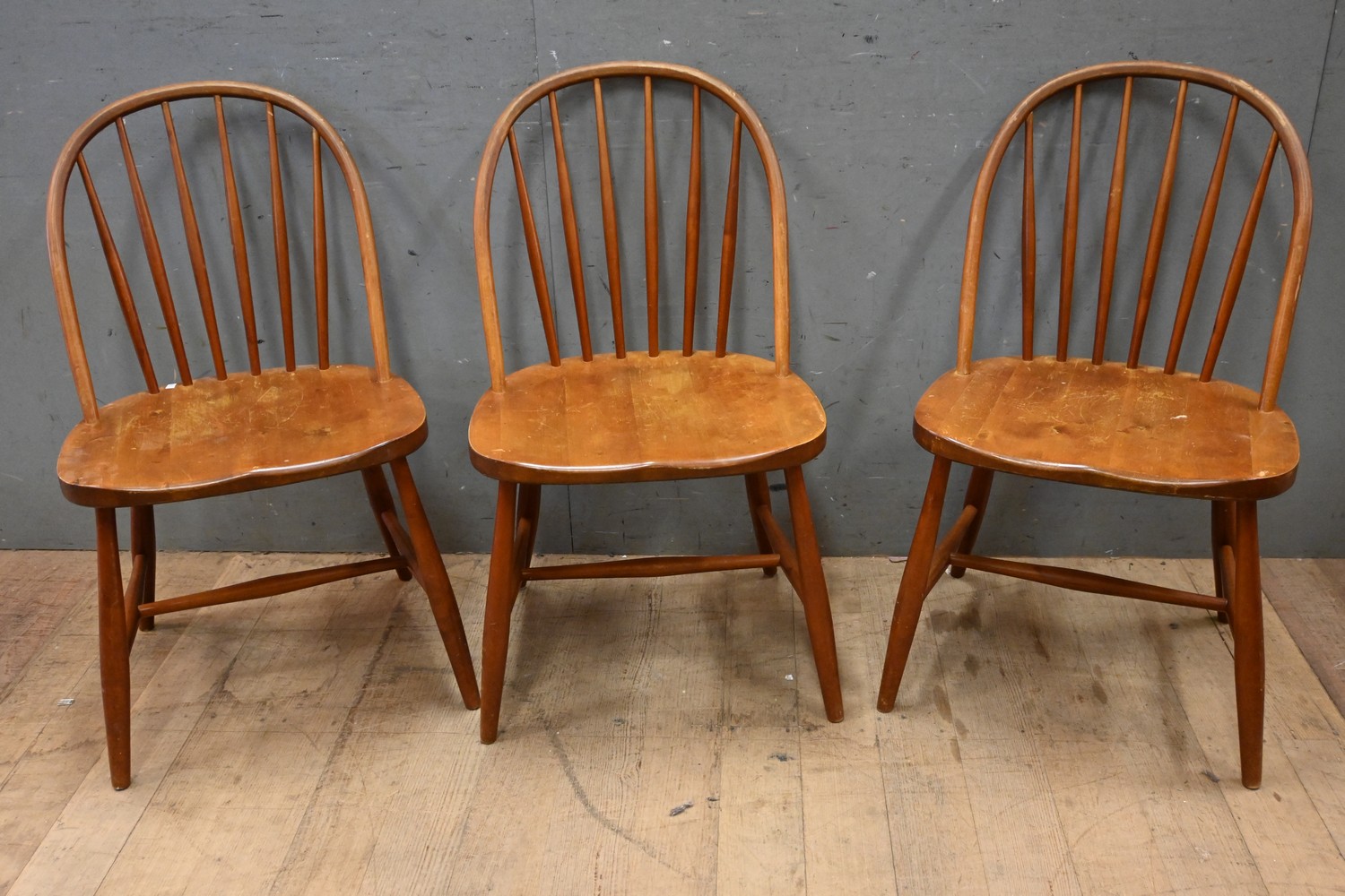 A SET OF THREE DANISH SPINDLEBACK CHAIRS (A/F) (H82 X W47 X D50 CM) (LEONARD JOEL DELIVERY SIZE: LARGE)