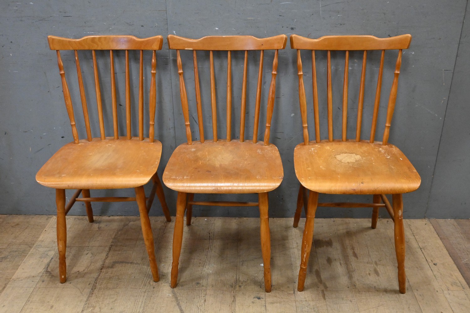 A SET OF THREE DANISH SPINDLE BACK CHAIRS (A/F) (H85 X W41 X D49 CM) (LEONARD JOEL DELIVERY SIZE: LARGE)