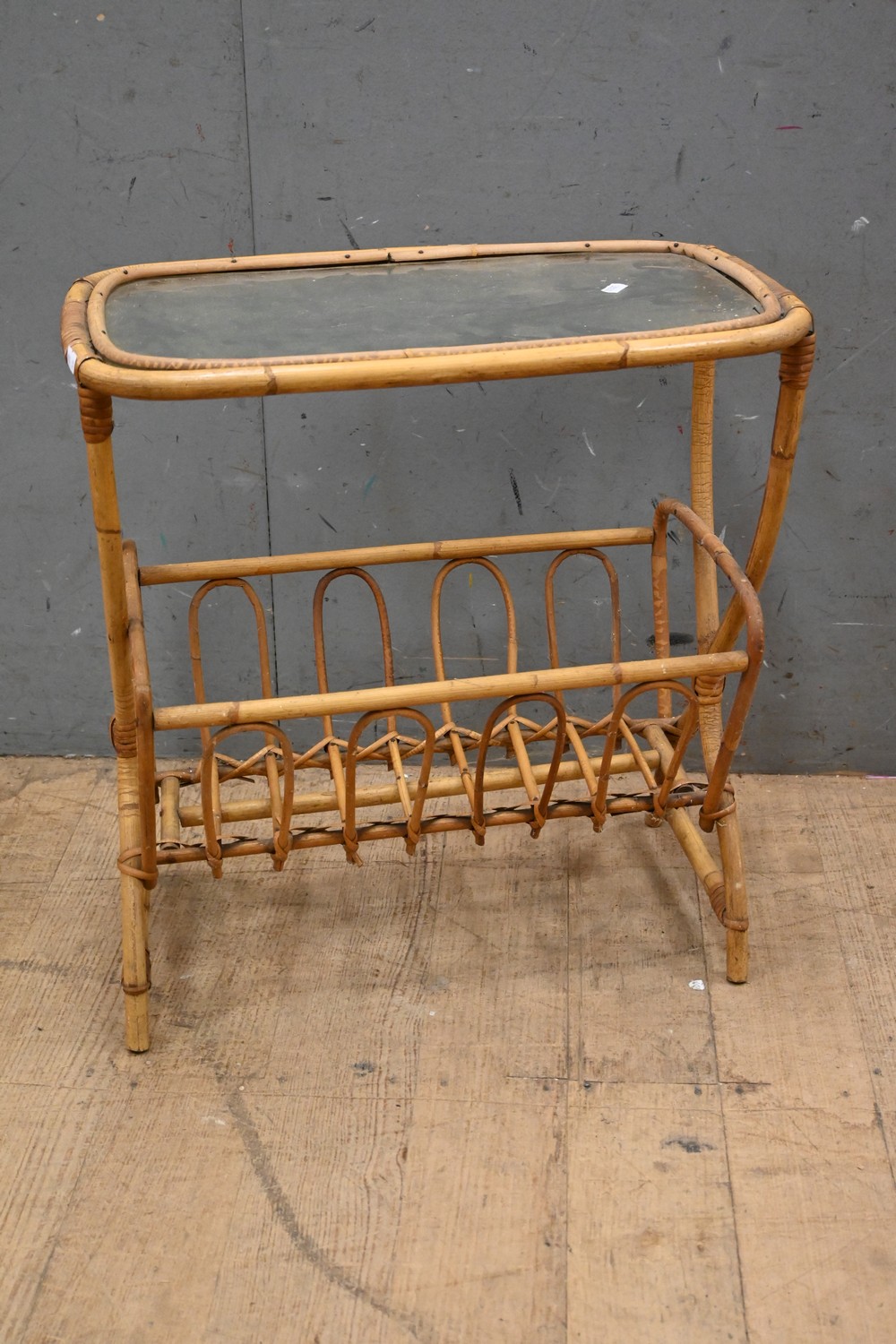 A DANISH CANE AND GLASS TOPPED SIDE TABLE WITH MAGAZINE RACK (H52 X W51 X D30 CM) (LEONARD JOEL DELIVERY SIZE: MEDIUM)
