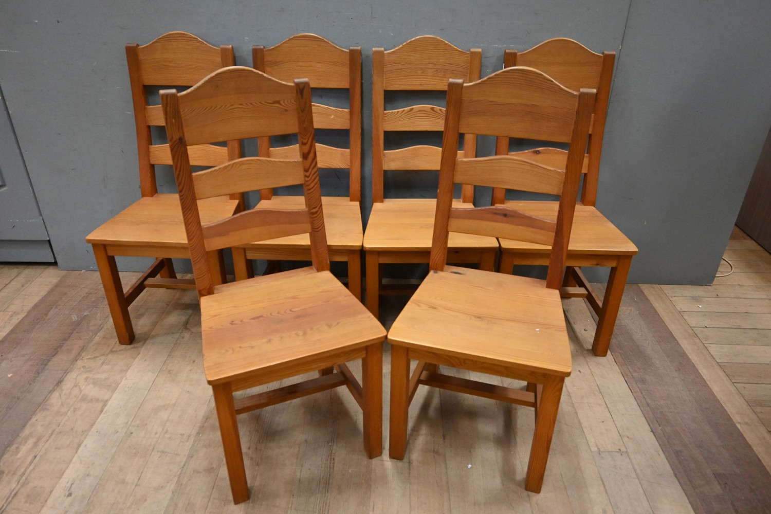 A SET OF SIX DANISH PINE DINING CHAIRS (H102 X W44 X D58 CM) (LEONARD JOEL DELIVERY SIZE: EXTRA-LARGE)
