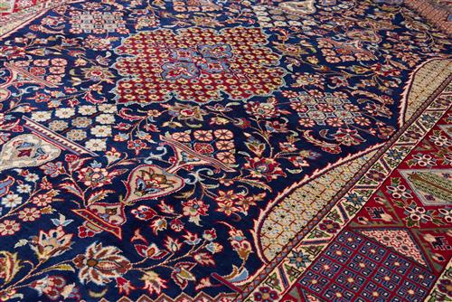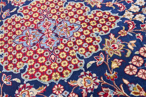 A FINE PERSIAN ISFAHAN CARPET. 100% FINE WOOL PILE. HAND-KNOTTED & WITH CLASSIC ISFAHAN DESIGN OF CENTRAL MEDALLION IN FRENCH BLUE CONTAINING 'ZEL-E - SULTAN' - URNS WITH BLOSSOMING FLOWERS ON AN OUTER BORDER OF MINA KHANA & QUARTERED CORNER MEDALLIONS IN FRENCH IN A FLORAL DESIGN. BLUE & CREAM. BORDER OF DIAMOND SHAPE DESIGN OF WILLOW TREES AND MINA KHANA PATTENS. THIS RUG IS THE FINEST OF THE NAJAFABAD COLLECTIONS. IN EXCELLENT CONDITION. SIZE: 308 X 214 CM ORIGIN: PERSIA - RRP: $6,500 DOCUMENTATION OF AUTHENTICITY INCLUDED.