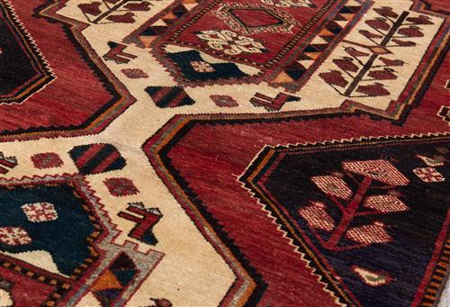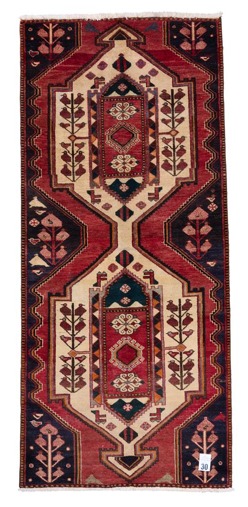 A TRIBAL PERSIAN BAKHTIAR BABAHEYDAR RUG, 100% WOOL, NATURAL DYES. HAND-KNOTTED TRIBAL WEAVE AND DESIGN OF DOUBLE BOLD MEDALLIONS CONTAINING TREE OF LIFE & FLORAL PATTERNS ON A CREAM TONE FIELD. CORNER TREE OF LIFE MEDALLIONS ON A RICH CHARCOAL FIELD. ALL OVER FIELD OF SOFT RED. SIZE: 300 X 130 CM ORIGIN: IRAN - RRP: $1,900 DOCUMENTATION OF AUTHENTICITY INCLUDED.