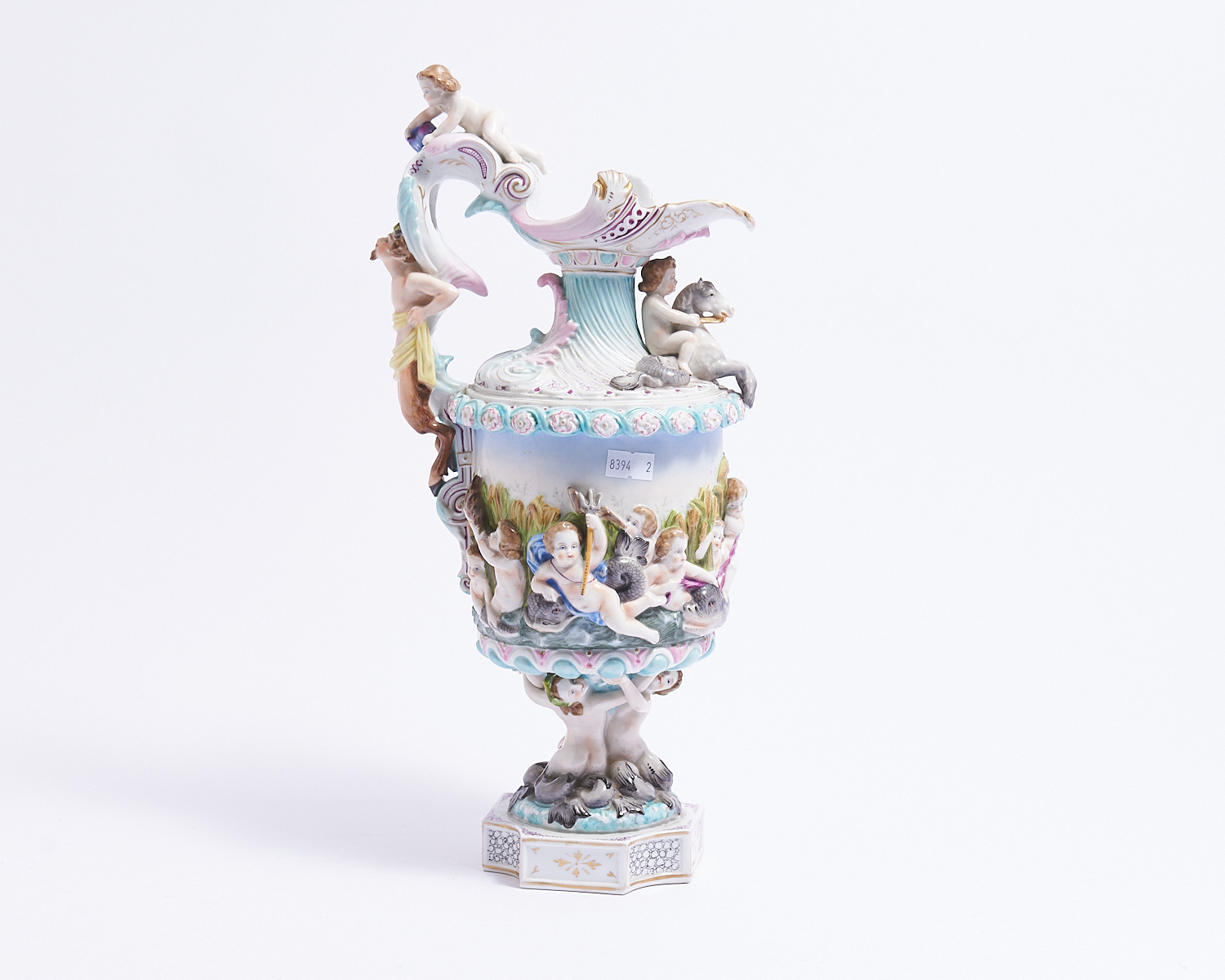 A PORCELAIN CHERUB DECOARTED JUG H.37.5CM, LEONARD JOEL LOCAL DELIVERY: MEDIUM
