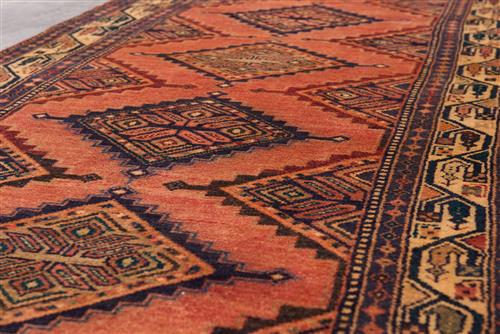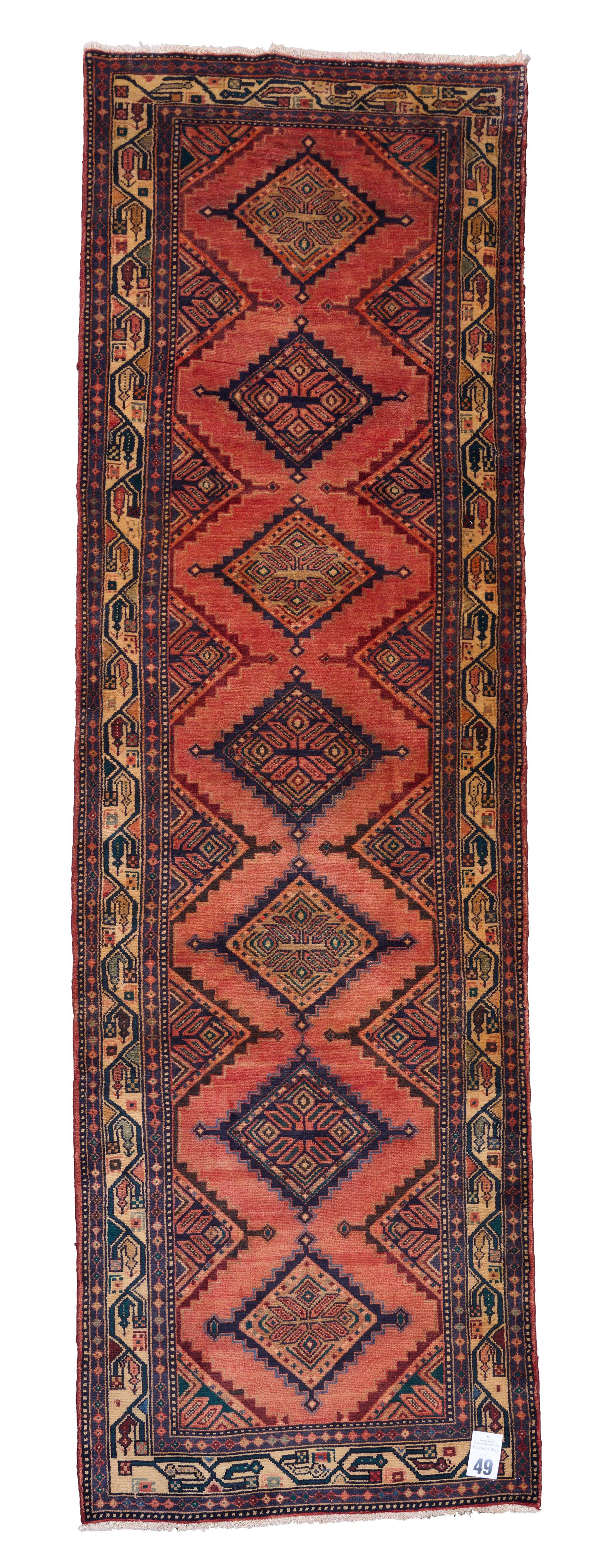 A TRIBAL HAND-KNOTTED PERSIAN ZAGEH RUNNER. CONTINUING DIAMOND SHAPED MEDALLIONS IN AN OPEN RUSTY RED FIELD. 100% WOOL & NATURAL DYES. DENSE PILE. BORDER OF TRIBAL MOTIFS. SIZE: 353 X 107 CM ORIGIN: IRAN - RRP: $2,600 DOCUMENTATION OF AUTHENTICITY INCLUDED.