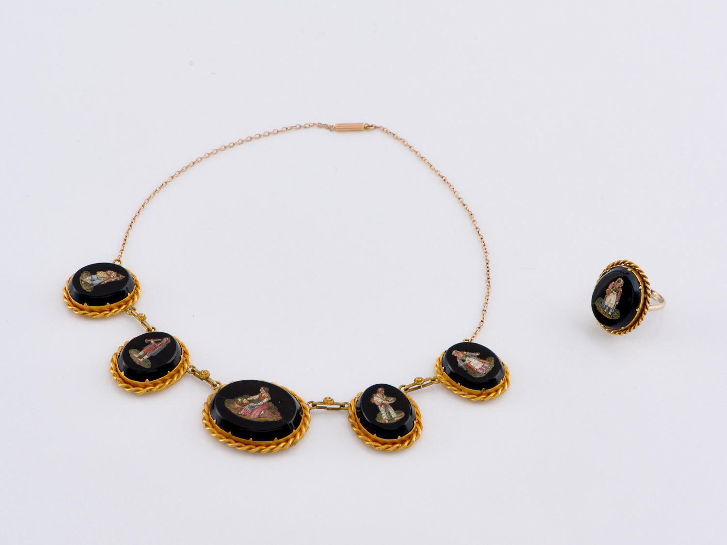 A MICRO MOSAIC SUITE IN GILT, INCLUDING A NECKLACE AND A RING, RING SIZE J/K