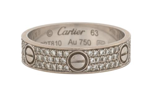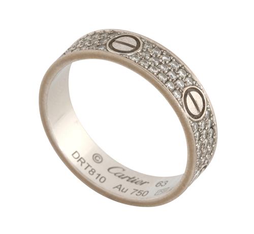 CARTIER, 18CT WHITE GOLD AND DIAMOND 'LOVE' RING, THE BAND SET WITH AFTER-MARKET BRILLIANT-CUT DIAMONDS TOGETHER WEIGHING APPROXIMATELY 1.09 CARATS, SET AT INTERVALS WITH SCREWHEAD MOTIFS, SIGNED CARTIER, NUMBERED DRT810, SIZE U (63), ACCOMPANIED BY CARTIER CERTIFICATE, BOX AND OUTER BOX