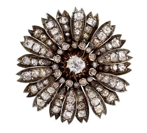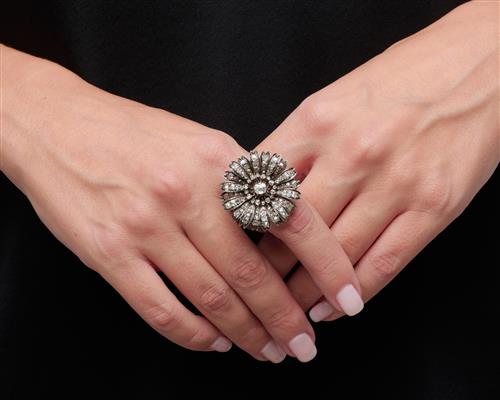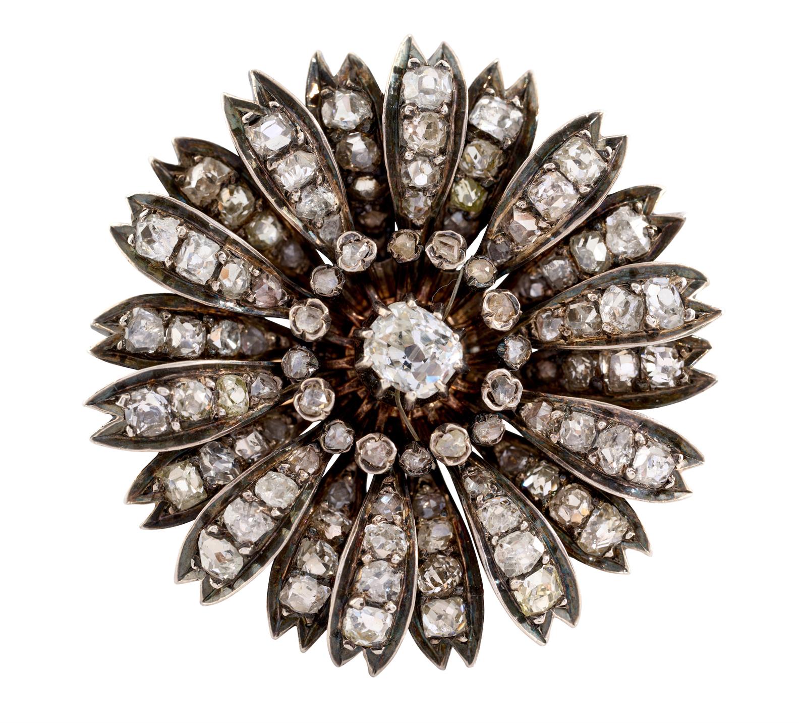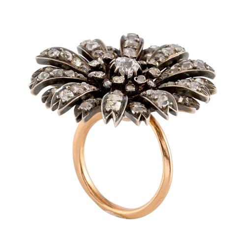 A FLORAL DIAMOND CLUSTER RING IN 18CT ROSE GOLD AND SILVER, CENTRING AN OLD MINE-CUT DIAMOND WEIGHING APPROXIMATELY 0.70 CARATS, WITHIN A SURROUND OF PETALS DETAILED WITH FURTHER MINE-CUT DIAMONDS TOGETHER WEIGHING APPROXIMATELY 3.00 CARATS, SIZE L