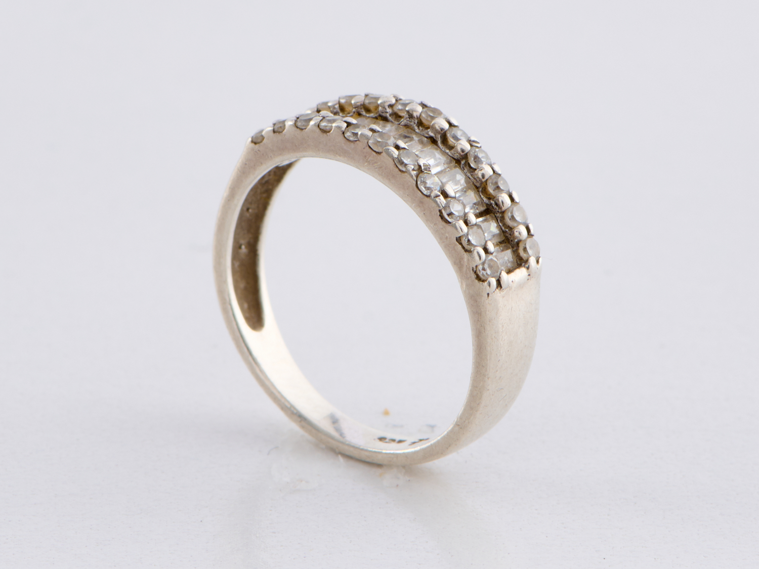 A HALF HOOP DIAMOND RING IN 18CT WHITE GOLD, RING SIZE M, 2.83GMS