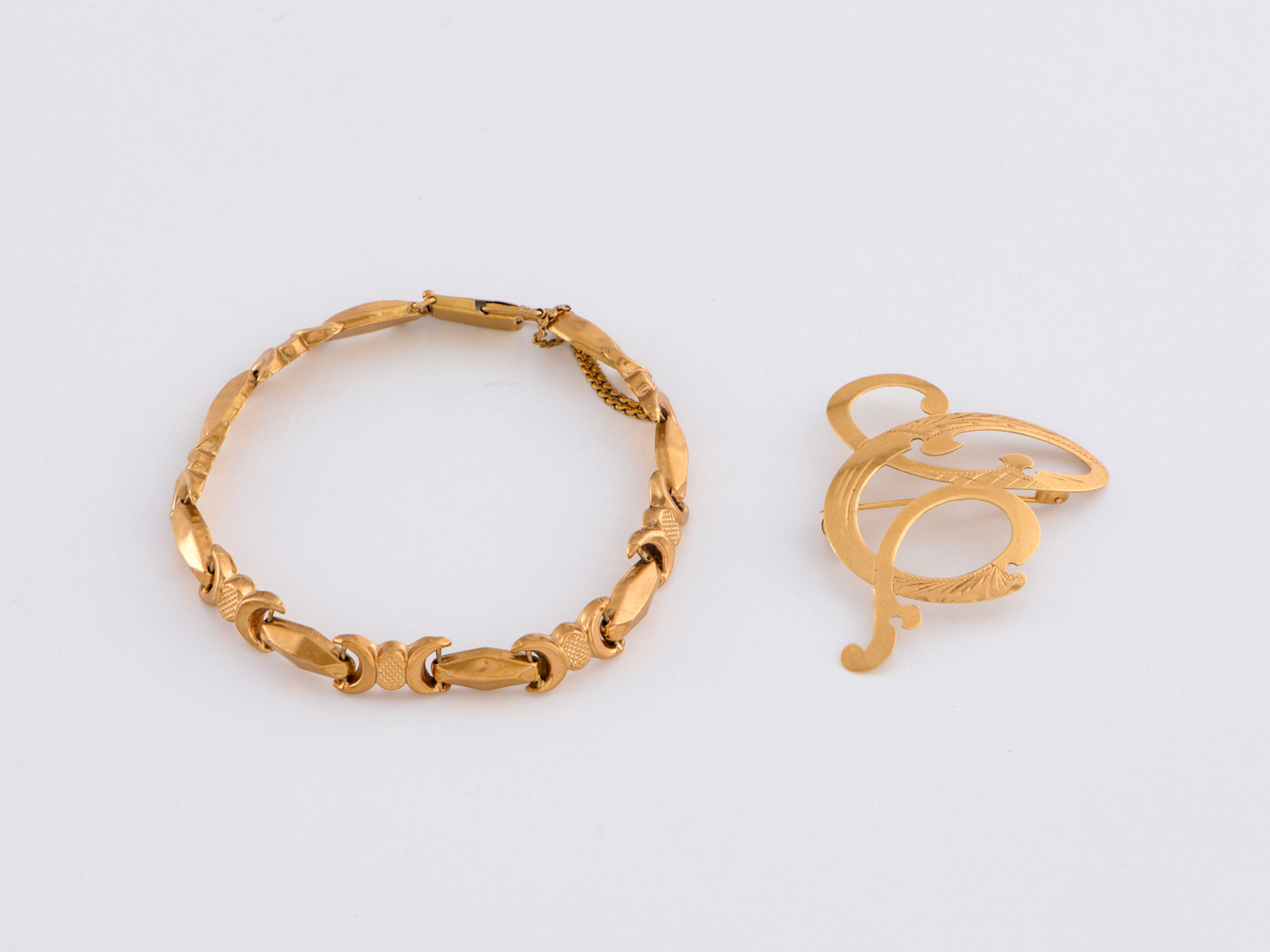 A FANCY LINK BRACELET AND INITIAL BROOCH, BOTH IN 18CT GOLD, 11.62GMS