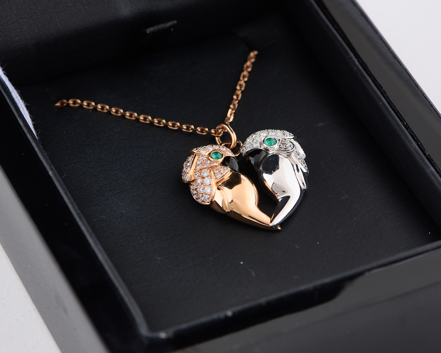 A DIAMOND, EMERALD AND ONYX PARROT PENDANT IN 18CT WHITE AND PINK GOLD, TO A CHAIN IN 18CT GOLD, 10.27GMS